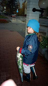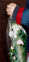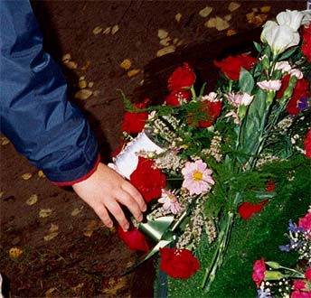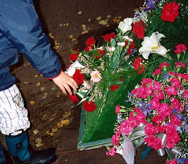 kukat papan haudalle syksyn lehtien putoillessa. |