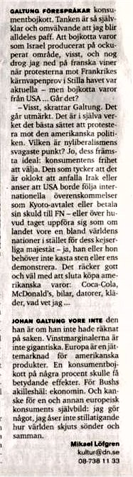 JOHAN GALTUNG, DAGENS NYHETER, TORSDAG 16 JANUARI