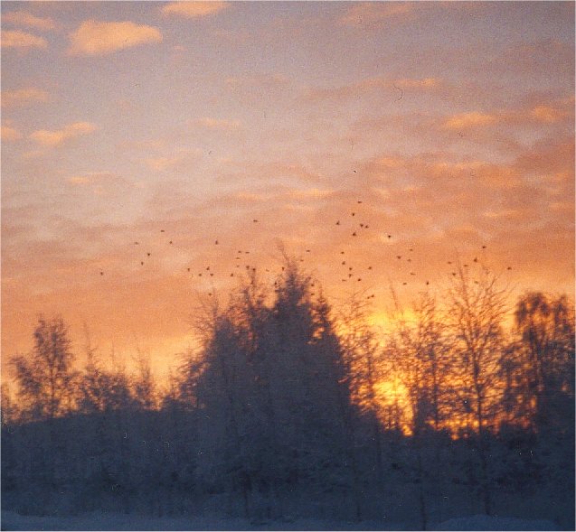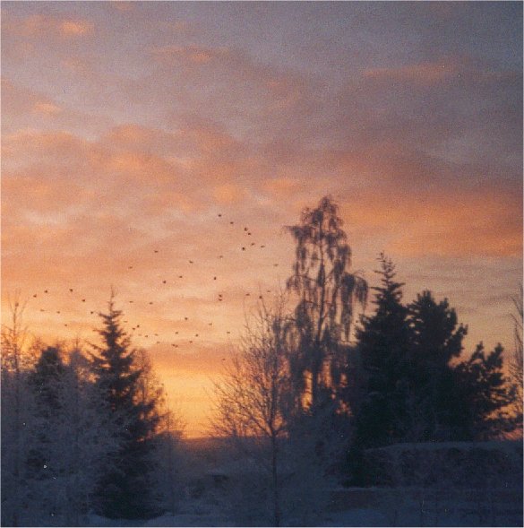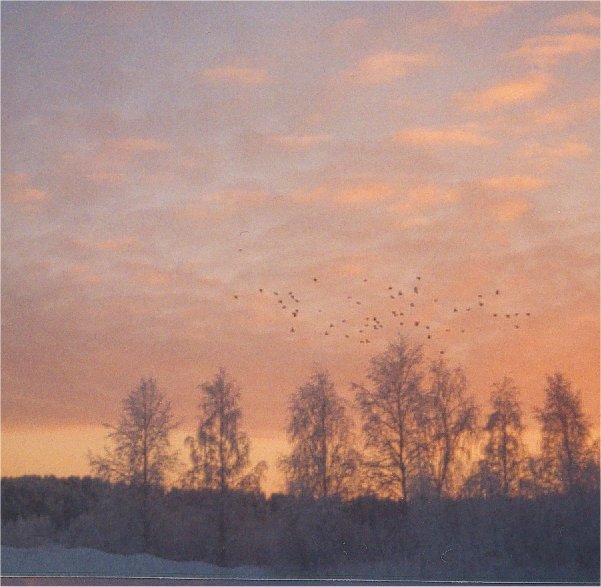 kylmimpänä (?) päivänä varisparvi ilta-auringon