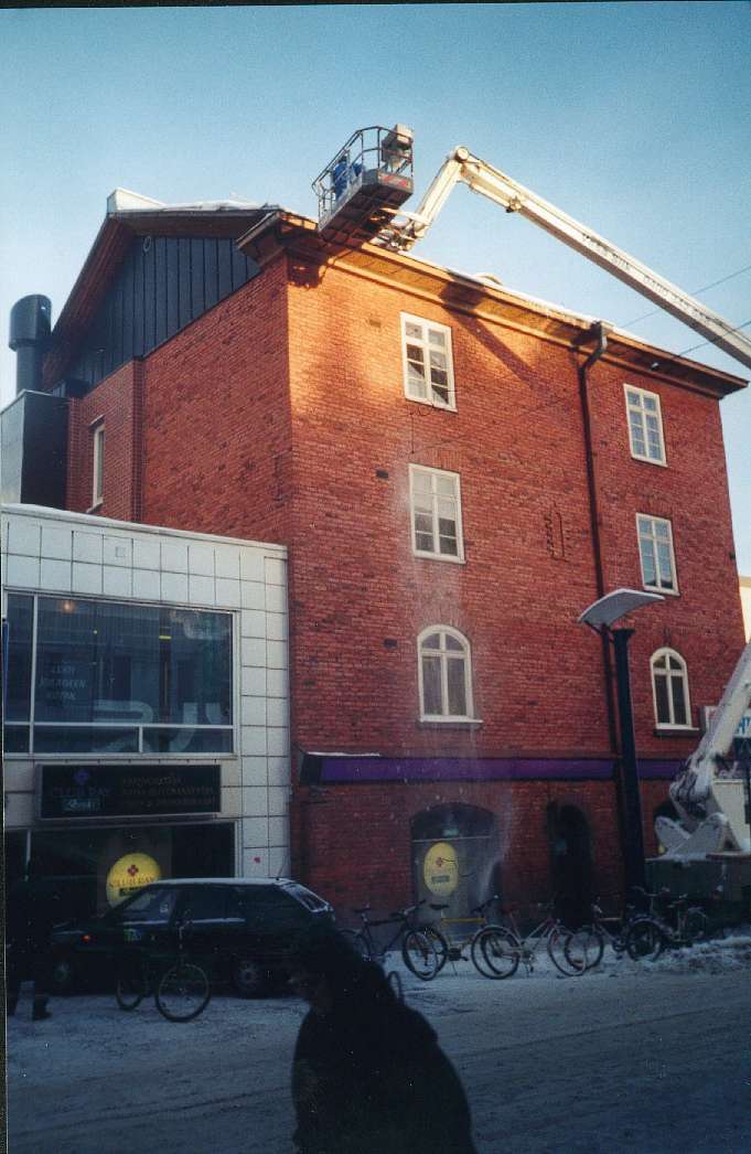 Kolme kuvaa Jyväskylässä. Lumen pudotus. Perjantaina 17.01.2003. Kuvannut Pertti Manninen ohikulkiessaan. Koko ajan ympärilläni kuhisee ihmisiä. Koko ajan teen havaintoja. Välillä filmille tallentaen. Päivällä on hiukan lämpimämpää ja päiväkin alkaa pidetä silmissä. Ennätyskylmä tammikuu pistää ajattelemaan, miksei täältä lämpimämpään paikkaan pääse? Sisällä on onneksi lämmintä ja valitus loppuu olosuhteiden pakosta! Pertti Manninen 06.02.2003.