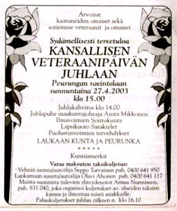 JUHLAAN Peurungan ravintolaan sunnuntaina 27,2,2003 klo 15.00.