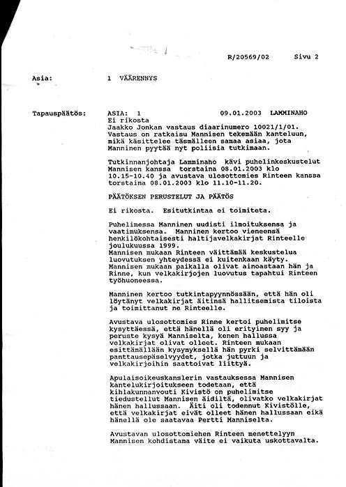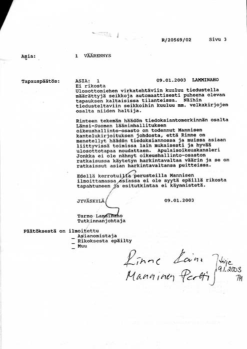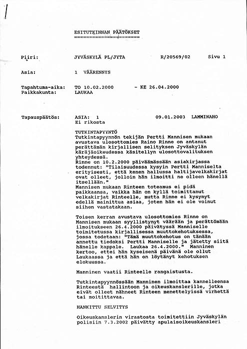 TOIMITUS. Päätoimittaja. Yhteydenotto: nettisanomat@hotmail.com. Copyright nettisanomat.com 2003/214. Sivut valmisti Pertti Manninen 04.09.2003, (September 5, 2003 0:02). Vanhempi kesätoimittaja ja kesätoimittaja. Kuvannut Pertti Manninen. 2003/09/04 - nettisanomat.com - Tarmo Lamminaho esitutkinnan päätökset - Asiakirjoja. - 09.01.2003. Esitutkinnan päätökset (Tutkinnanjohtaja Tarmo Lamminaho). - 30.12.2002. - Rikosilmoitus asiakirjaväärennöksistä... (Atk-suunnittelija Pertti Manninen). Liite. Lausunto valitukseen nro 2/00. (Kihlakunnanvouti Jarmo Kivistö) Liitteen liite. Selitys Laura Mannisen ulosottovalitukseen. (Avustava ulosottomies Raino Rinne). Liite. Selitys Laura Mannisen ulosottoasiassa 00/733 (Pertti Manninen). 09.01.2003. Esitutkinnan päätökset (Tutkinnanjohtaja Tarmo Lamminaho). 15.01.2003. Syyteharkinta 30.12.2002 tekemässäni... (Atk-suunnittelija Pertti Manninen). Liite: Korkeimman oikeuden päätös. (Oikeusneuvokset Lindholm ja Koskelo). 20.05.2003 Vastaus tutkinta- ja syyteharkintapyyntöön. (Kihlakunnansyyttäjä Sirpa Hautakangas). 17.06.2003 (Valtakunnan syyttäjälle) Syyteharkinta ... (Atk-suunnittelija Pertti Manninen). 25.08.2003. Pertti Mannisen kirjoitus. (Apulaisvaltakunnansyyttäjä Jorma Kalske). - JYVÄSKYLÄ/PL/JYTA R/20569/02, Pertti Manninen, avustava ulosottomies Raino Rinne, apulaisoikeuskansleri Jaakko Jonkka, diaarinumero 10021/1/01, kihlakunnanvouti Kivistö, Länsi-Suomen lääninhallituksen oikeushallinto-osasto, tutkinnanjohtaja Tarmo Lamminaho.- 04.09.2003 - avoin - joka torstai - kuva - kuvat - pertti manninen - nettisanomat. |