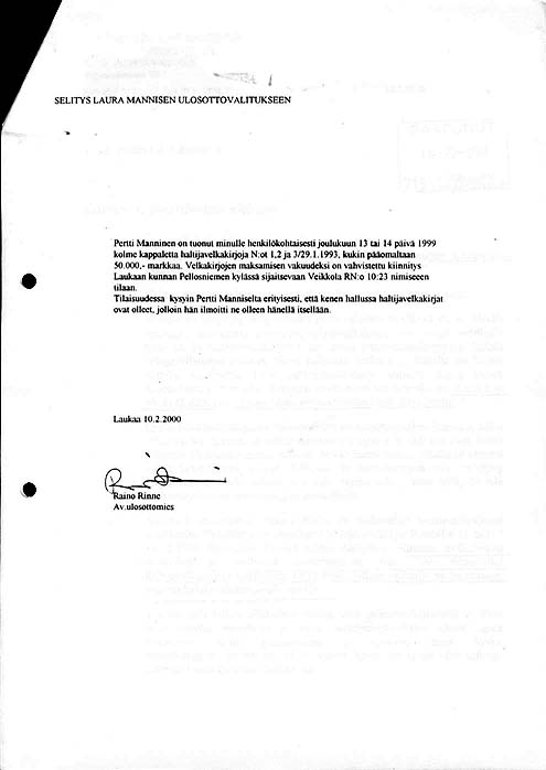 Liitteen liite. Selitys Laura Mannisen ulosottovalitukseen. (Avustava ulosottomies Raino Rinne).![]() |