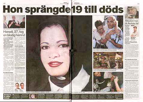 Hanadi 27, tog en blodig hämnd Jerusalem. Hanadi Jaradat sköt ner säkerhetsvakten utanför restaurangen i Haifa. Sedan gick hon i lokalen och utlöste sin tio kilo tunga bomb. Minst nitton personer dödades och 50-tal skadades i det blodigaste självmordsattentatet i Israel på flera år. ... Den 12 juni kom israelisk militär till den unga kvinnans familj för att gripa kusinen Salah, medlem i islamiska jihad. Det slutade med att kusinen och den unga kvinnans bror Faadi sköts ihjäl. Hanadi Jaradat sprang ut när hon hörde skotten, men motades bort av soldaterna. Aftonbladet Söndag 5 oktober 2003. Oisin Cantwell, Mats Gezelius |