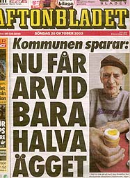 fick Arvid Hansson, 87, beskesdet. - Så länge det här idiotiska beslutet inte är upphävt tänker jag inte äta något ägg. Jag har aldrig varit med om något liknande i hela mitt liv, säger han. Den som ytterst fattar beslut i frågan är avdelnunsföreståndaren. Aftonbladet har förgäves sökt henne. Bara ett halvt ägg till frukost. Aftonbladet. Annacarin Falck. Söndag 26 oktober 2003.