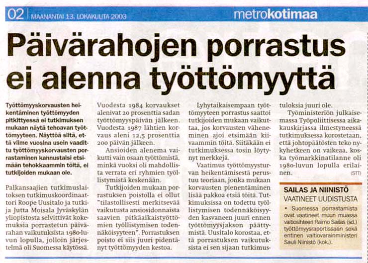 Helsingin Sanomat. Kotimaa. Päivi Repo. Keskiviikkona 15.10.2003. "Työttömät eivät vieroksu työtä, nuoret ja ylivelkaantuneet eivät velkaannu holtittoman rahankäytön takia eivätkä kuntalaiset kannata palvelujen supistuksia. Tällaisia usein