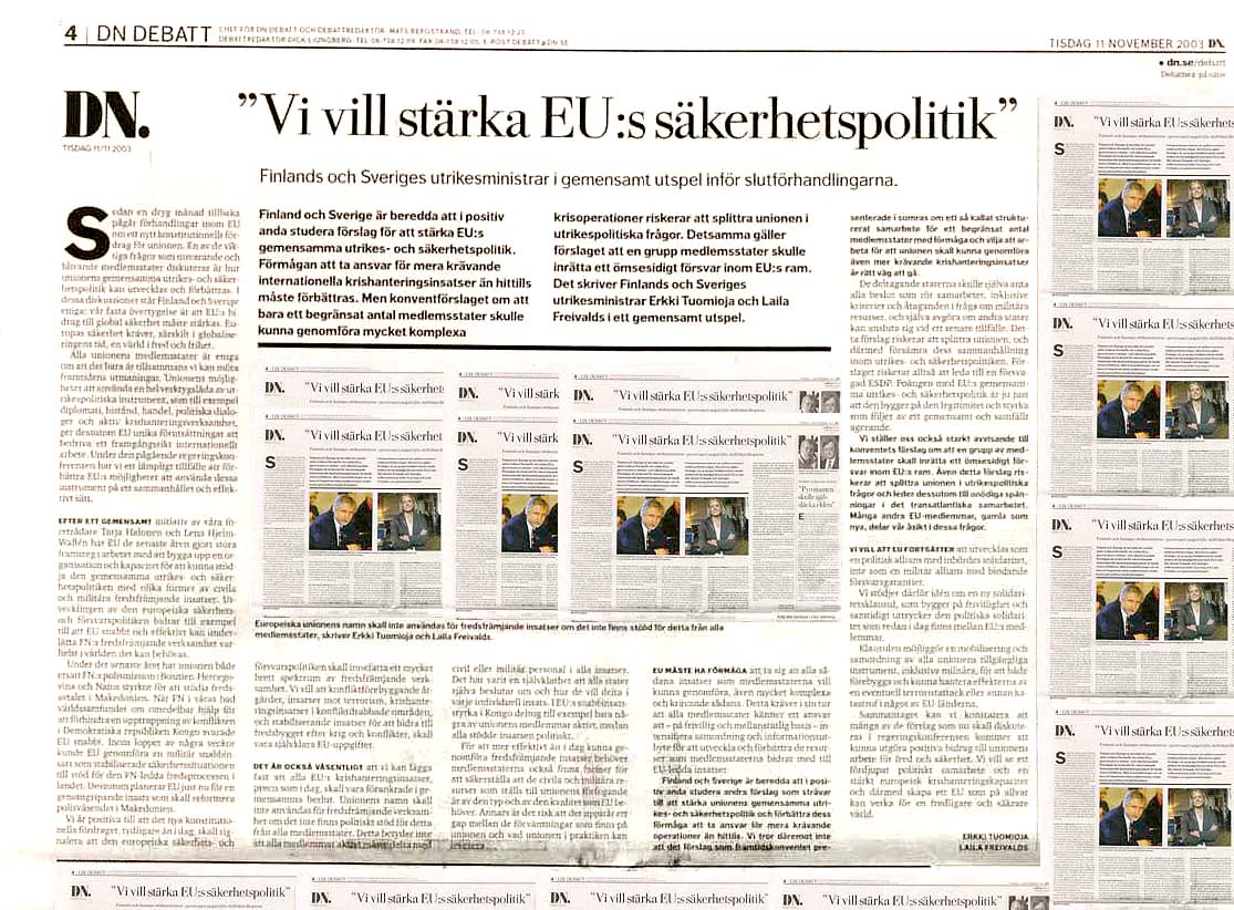 TOIMITUS. Päätoimittaja. Yhteydenotto: nettisanomat@hotmail.com. Copyright nettisanomat.com 2003/224. Sivut valmisti Pertti Manninen 13.11.2003, (November 15, 2003 11:46). Vanhempi kesätoimittaja ja kesätoimittaja. Kuvannut Pertti Manninen. 2003/11/13 - nettisanomat.com - "Vi vill stärka EU:s säkerhetspolitik". - Erkki Tuomioja och Laila Freivalds - Dagens Nyheter. Debatt. Tisdag 11 November 2003. - 13.11..2003 - avoin - joka torstai - kuva - kuvat - pertti manninen - nettisanomat. |