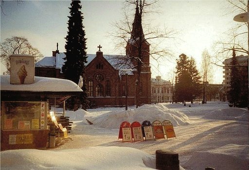 Kirkon takaa näkyy vilaus Jyväskylän kunnallistalosta, josta kaupunginjohtaja Pekka Kettunen lähtee lätkimään parin kuukauden päästä kuuluisa eroraha taskussaan.