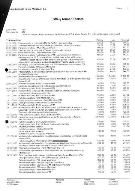 Tässä toisessa toisessa laskussa asian on jo muuttunut. Asia: Pertti ja Laura Manninen. Täytäntöönpanoriitatoimeksiantoon kirjatut PMn (ja LMn) henkilökohtaiset toimenpiteet, joita ei ole voitu sisällyttää kanneasian maksuttomaan oikeudenkäyntiin. Maksajaksi merkitty Pertti Juhani ja Laura Aliina Manninen c/o Pertti Manninen. Näitä laskuja asianajaja Pekka Mononen sitten esitteli oikeudessa. Ne olivat toimenpiteiltään samat, mitkä hän oli esittänyt äitini maksuttoman oikeudenkäynnin laskutuksesta päättävälle käräjäoikeuden tuomari Päivi Penttiselle. Tämä ilmenee oikeudenkäyntipöytäkirjoista. Tulossa: Maksuttoman