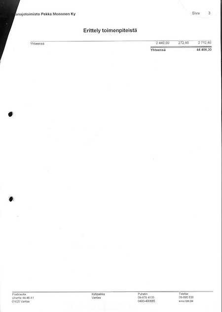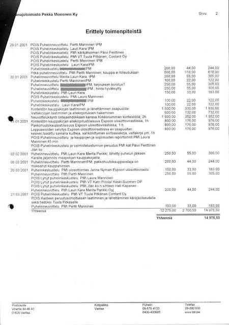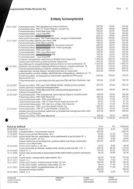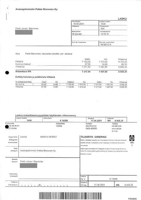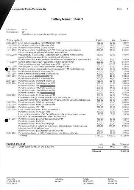 asianajaja Pekka Mononen livahti ulos todistusta jättämättä. Kevään 2001 elimme uskossa, että kaikki on nyt hyvin. Olihan pankki akordoinut velkani, oikeastaan vasta silloin kun toisen pakkohuutokaupan, Kirkkonummen vuokraoikeuden ja talon, rahat olisivat pankin tilillä. Rahat tulivat tilille huhtikuun lopussa ja toukokuun lopussa sitten kolahti: asianajaja Pekka Mononen ei ollutkaan tyytyväinen saamaansa korvaukseen. Hän vaati ensin minulta lisää ja reklamoituani vaati minulta ja äidiltäni yhteisesti. Asian kulku: Asianajaja Pekka Monosen laskut minulle ja sitten minulle ja äidilleni yhteisesti. Asianajaja Juhani Elon laskut äidilleni, toimeksiantajana asianajaja Pekka Mononen. Haastehakemus äidilleni ja minulle Jyväskylän käräjäoikeuteen, joka myöhemmin peruutettiin. Haastehakemus minulle Jyväskylän käräjäoikeuteen. Asian käsittely käräjäoikeudessa ja päätös Asian käsittely hovioikeudessa ja päätös. Valituslupahakemus Korkeimpaan oikeuteen. Korkeimman oikeuden päätös: Valituslupaa ei myönnetä.