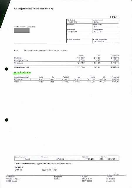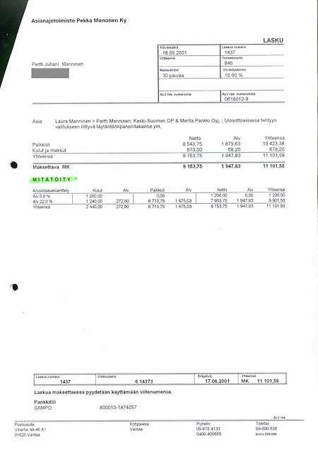 Pertti Manninen Asianajotoimisto Pekka Mononen Ky. Kiistin laskujenne