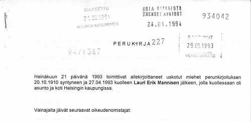 Heinäkuun 21 päivänä 1993 toimittivat allekirjoittaneet uskotut miehet perunkirjoituksen 20.10.1910 syntyneen ja 27.04.1993 kuolleen Lauri Erik Mannisen jälkeen, jolla kuollessaan oli asunto ja koti Helsingin kaupungissa. Vainajalta jäivät seuraavat oikeudenomistajat: Vainaja ei ole antanut mitään ennakkoperintöä, lahjaa tai muuta etuutta, joka olisi otettava huomioon perintöveroa määrättäessä. Pesän ilmoittajana vakuutan valaehtoisesti, että antamani tiedot ovat oikeat ja etten tahallisesti ole jättänyt mitään ilmoittamatta. Helsingissä 21 päivänä heinäkuuta 1993 Laura