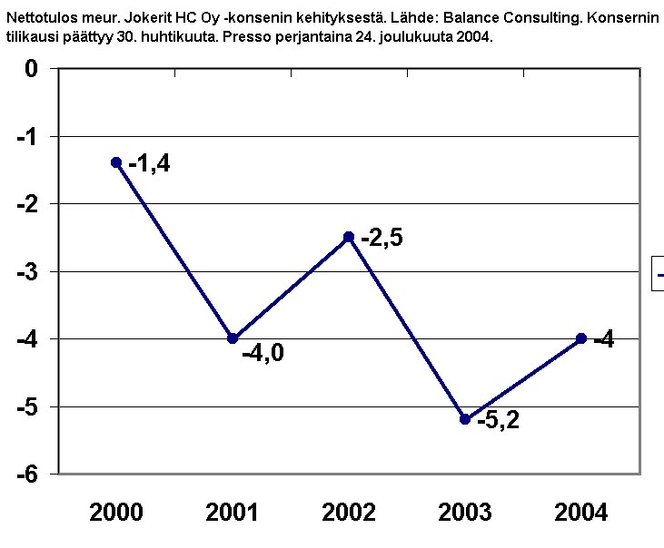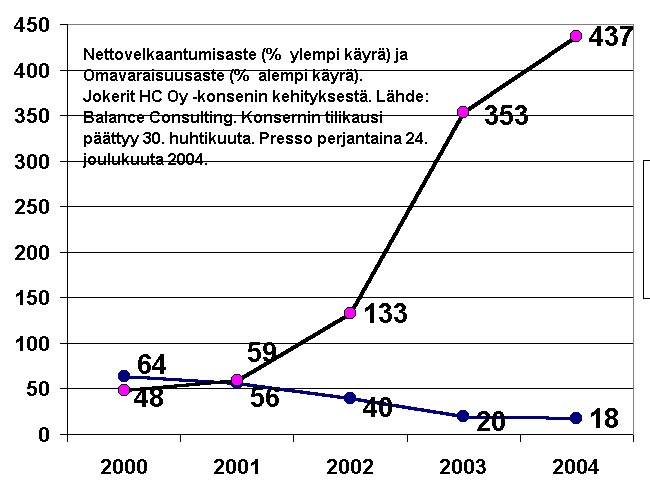 perjantaina 24. joulukuuta 2004. Kaavio: Nettovelkaantumisaste (% ylempi käyrä) ja Omavaraisuusaste (% alempi käyrä). Jokerit HC Oy -konsenin kehityksestä. Lähde: Balance Consulting. Konsernin tilikausi päättyy 30. huhtikuuta. Presso perjantaina 24. joulukuuta 2004. "Analyysitalo Balance Consultingin laskelmien mukaan Jokerit HC:n oma pääoma kestää nykyistä tappiotahtia enää muutaman vuoden." Presso perjantaina 24. joulukuuta 2004. Lue myös!