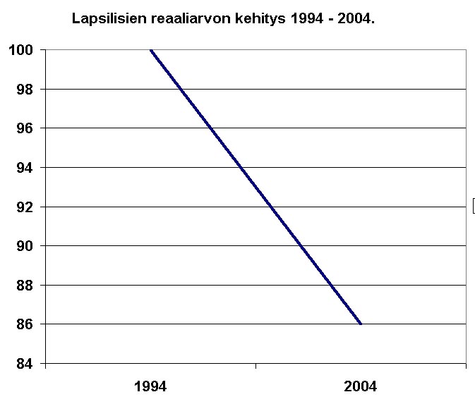 ![]() "Lapsilisän reaaliarvo on nyt 14 prosenttia alempi kuin 10 vuotta sitten." Kaavio "Lapsilisien reaaliarvon kehitys 1994 - 2004" laadittu nettisanomien toimituksessa. Se on vain ohjeellinen! |