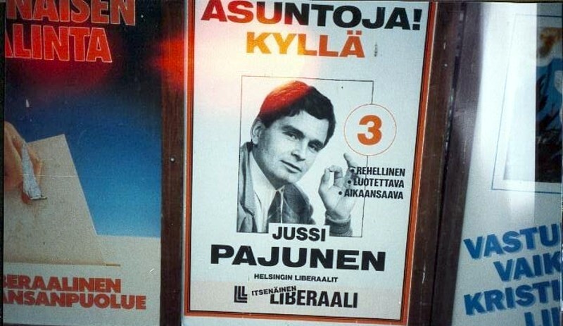 aarteita". Kuva 1980-luvulta Helsingistä.![]() "Asuntoja! Kyllä. 3. Rehellinen. Luotettava. Aikaansaava. Jussi Pajunen. Helsingin Liberaalit. Itsenäinen liberaali." Kuva: Pertti Manninen. Kokoomuslainen Jussi Pajunen valittiin tänään keskiviikkona 30.03.2005 alkuillasta Helsingin uudeksi kaupunginjohtajaksi 01.06.2005 alkaen Kokoomuksen, SDP:n ja Vihreiden tekemän ennakkosopimuksen mukaisesti. Jussi Pajunen seuraa tehtävässään kokoomuslaista Eva-Riitta Siitosta, joka aikoinaan voitti äärimmäisen niukasti SDP:n ehdokkaan nykyisen apulaiskaupunginjohta Pekka Korpisen. Silloin kokous venyi yli puolenyön ja tulos oli loppuun asti epävarma. Silloinkin oli ennakkosopimus. Sopimuksen mukaan Pekka Korpinen piti valittaman, mutta sopimus oli hölmö, koska sopijilta puuttui yksi ääni ja niin Eva-Riitta Siitonen tuli valituksi. Tässä 1980-luvun (luulen niin) arkistokuvassa Jussi Pajunen on ehdokkaana vielä liberaalien listoilla ja vaatii Asuntoja! Kyllä. Vaatimus on aina ajankohtainen. Heti valintansa jälkeen uutisstudioon kiidätettynä hän MTV3:n Kymmenen uutisissa vieritti Helsingin kymmenen vuoden asuntorakentamiskurjuuden syyksi Vuosaaren sataman rakentamisen viivästymisen. Lisäksi hän kaipasi ensimmäisenä tärkeimpänä asiana seudullista yhteistyötä. Haastattelu oli laadittu niin, että väliin näytettiin koululaisten ja vanhempien mielenosoitusta Roihuvuoressa, jossa koulu aiotaan lakkauttaa. Lapsiakin haastateltiin. Riittää tässä uudella kaupunginjohtajalla tehtäviä kaikilla saroilla. Asuntorakentamisen suhteen saa nähdä muuttuuko mikään. Niin kauan kuin ihmisten perustarpeiden tyydyttäminen on bisneksen varassa voi kurjuuden ennustaa jatkuvan. Niin kaun kuin rakentamisessa voidellaan erilaisia intressejä voi kurjuuden ennustaa jatkuvan. Ja niin kauan kuin korruptio ja kähmintä näillä alueilla tuottaa hyvin voi kurjuuden ennustaa jatkuvan. Jussi Pajusella on ihan omiakin intressejä. Malmin lentokentän rakentaminen asuntoalueeksi hyödyttää aivan suoraan hänen ja sukulaistensa omistuksia ja hyvinvointeja. Toivottavasti Jussi Pajunen haluaa jäädä historiaan muuna kuin tahdottomana marionettina ja oman edun tavoittelijana. Seitsemässä vuodessa kyllä ehtii jotakin, jos vain näkemystä ja inhimillisyyttä piisaa. Niinkuin silloin 80- luvulla: Rehellinen. Luotettava. Aikaansaava. Jussi Pajunen. Nettisanomat. Pertti Manninen. Pääkirjoitus keskiviikkona 30.03.2005. Katso myös! "Kansalaiset etsivät reittejään senaatintorilla Valtioneuvoston linnan kiertäen keväällä 1980-luvulla. EU:n perustuslaki tulossa!" Arkistojen aarteita 03.03.2005. |