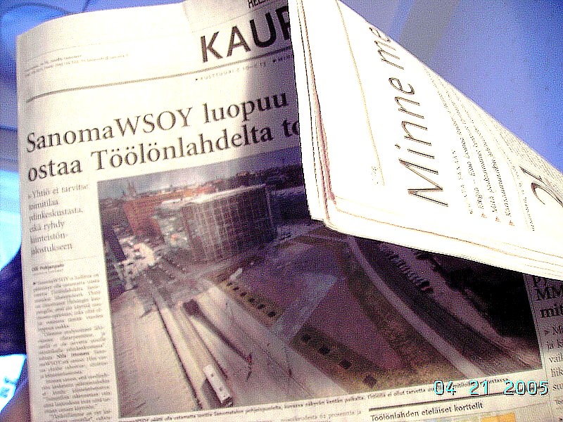 Nettisanomat torstaina 28. huhtikuuta 2005. "SanomaWSOY luopuu oikeudestaan ostaa Töölönlahdelta toinen tontti". Helsingin Sanomat torstaina 21.04.2005. Lue! | ![]() |
