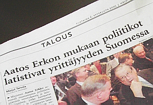 Aatos Erkon mukaan poliitikot latistivat yrittäjyyden Suomessa. Helsingin Sanomat. Talous. Tiistaina 06.09.2005. Marjut Tervola. Ministeri Aatos Erkko arvosteli maanantaina poliittisia päättäjiä verotuksesta ja lainsäädännöstä, jotka haittaavat yrittäjyyttä ja yritystoimintaa. Erkon mukaan yrittäjyys latistettiin Suomessa ”aikoja sitten”, ja sama haluttomuus tukea yrittämistä jatkuu. ”Todellista taistelua yrittäjyyden puolesta eduskunnassa ei käydä”, Erkko totesi maanantaina eduskunnan lisärakennuksessa Suomalaisen yrittäjän päivän juhlatilaisuudessa. ... Tarkistettavaa olisi hänen mukaansa vallitsevassa ajattelutavassa, joka ”ei rohkaise yrittämistä millään tavoin - päinvastoin.” Yrittäjyyteen liitetään Erkon mukaan epäluuloa ja pahimmillaan kateutta. ”Yksityinen yrittäjä ei pääse hyötymään tuloksista. Ylisuuret palkat ja bonukset sen sijaan hyväksytään, kunhan ne eivät koske yrittäjäomistajaa”, hän sanoi. Erkko vaati poliittisilta päättäjiltä ryhtiä etenkin silloin, kun suomalaiset yritykset siirtävät tuotantoaan ulkomaille. ”Yritysten annetaan muuttaa maasta ilman, että niiltä vaaditaan minkäänlaisia korvauksia saaduista tuista vain muutamaa vuotta aikaisemmin - - vastuu on viime kädessä demokraattisesti valituilla poliittisilla toimijoilla”, Erkko arvosteli. Erkko myönsi olevansa yrittäjyyteen liittyvissä näkemyksissä ”hyvin pessimistinen”. Häntä ennen tilaisuudessa puhui eduskunnan puhemies Paavo Lipponen (sd), … ”Hän [Lipponen] oli hyvin optimistinen. Ehkä totuus on jotain tässä välissä”, Erkko sanoi. Erkko on SanomaWSOY:n suurin omistaja. Helsingin Sanomat kuuluu SanomaWSOY-konserniin. Tilaisuudessa puhui myös Suomen yrittäjien puheenjohtaja, kauppaneuvos Eero Lehti. Hän otti esille yrittäjävajeen. … Yksi yrittäjyyttä vähentävä tekijä on Lehden mukaan suomalainen konkurssilainsäädäntö. … ”Näyttää siltä, ettei oikeusministeriö ole halukas muuttamaan tätä yksittäistä lain kohtaa”, hän sanoi. Lehti epäili myös yrittäjäverotuksen kevennysten riittävyyttä. Kritiikkiä häneltä sai niin ikään suomalainen koulutusjärjestelmä, joka tuottaa valkolakkeja, mutta vain vähän yrittäjäksi soveltuvaa ainesta." Aatos Erkon mukaan poliitikot latistivat yrittäjyyden Suomessa. Helsingin Sanomat. Talous. Tiistaina 06.09.2005. Lue myös!