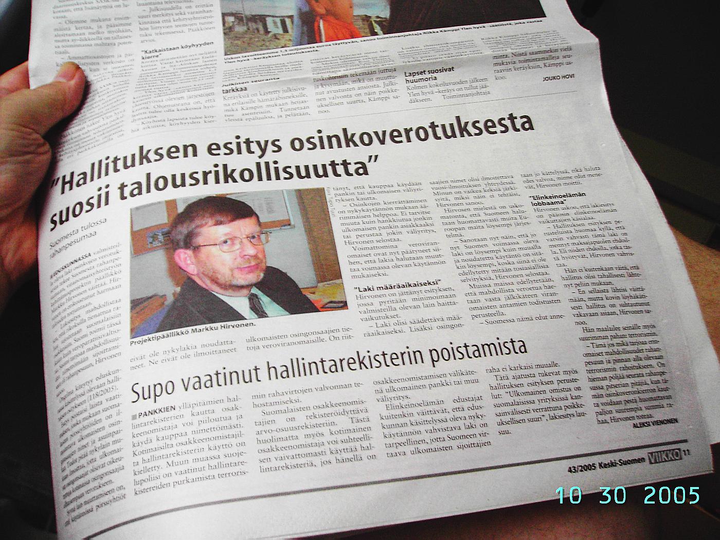 nettisanomat - 2005/11/14 - "verot verta juo" - Veronkiertoa esitetään jatkettavaksi! - Hallintarekisteri - Helsingin Sanomat Talous lauantaina 12.11.2005: "Valiokunta: Osinkoja voidaan maksaa myös anonyymeille. - Kimmo Pietiläinen. - "Hallituksen esitys osinkoverotuksesta suosii talousrikollisuutta". Markku Hirvonen samannimisessä jutussa, jonka kirjoitti Aleksi Vienonen. Keski-Suomen Viikko torstaina 27.10.2005. - osingot - osinkovero - hallintarekisteri - veronkierto - veronkierto - laki - maanantaina14.11.2005 - kuva - kuvat - pertti manninen - nettisanomat |
