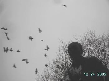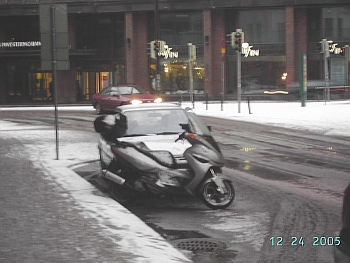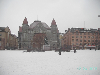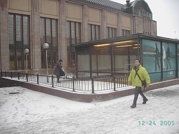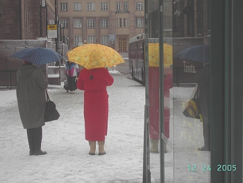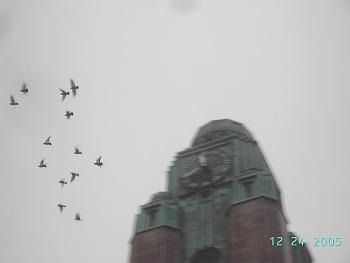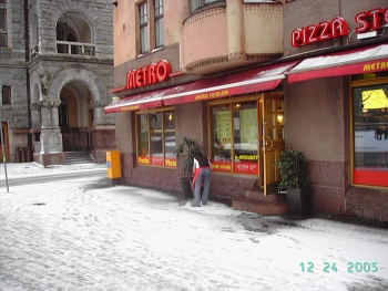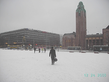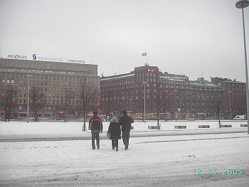 Hetkiä Helsingissä. Sohjoa Assan edessä. Lintujen ruokkija. Väriä harmauteen. Valkoinen tori. Kuusi makkaran päällä. Linnut ja aika. Harmaa teatteri? Aleksis Kiven joulu 1 & 2. Värikäs pizzeria. Sohjo sivuun. Harmaan sävyt. | "Matkalla Anttilasta Taloustaloon lamppua etsimässä ennen joulurauhan julistamista." Kuvat lauantaina, jouluaattona 24.12.2005 klo 11.38 -11.50. Pertti Manninen. |