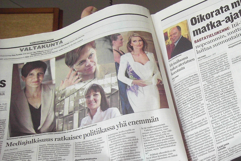 31. elokuuta 2006. "Heinäluoma tukee ateriatuen korotusta" . 2006-08-28 maananta. Keskisuomalainen. Tanja Saarelan kuva liittyy viereisellä sivulla oleviin kirjoituksiin "Naisen oltava viisas ja kaunis. Politiikka: Rumempikin mies pärjää hyvin, kun asiat ovat hallinnassa." ja "Mediajulkisuus ratkaisee politiikassa yhä enemmän." Kuva: Pertti Manninen. |