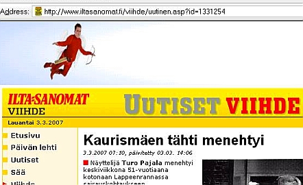 selostaessaan virhemarginaalit, jälleen kerran. Nettisanomat Perjantai 2007-02-23 ![]() ![]() ![]() Sipoo - Sibbo: Sibbofrågan behandlas av nästa regering (05:18 Yle Internytt) - Vanhanen: Sipoo-päätös jää seuraavalle hallitukselle (09:45 hs.fi) - Vanhanen: Sipoo-päätös jää seuraavalle hallitukselle (12:43 Yle uutiset). Perjantai 2007-02-23. Lue ja vertaa! Lue myös mm! Antti Kaikkonen: Sipoon puolesta. Lue! - Pääministeri puhelee joutavia (osa2) Lue! - Sipoo -Sibbo. Kirjoituksia. Lue! Nettisanomat Torstai 2007-02-22 Inget att vara stolt över. Sverker Åström lyssnar på Bildt – och tappar hoppet om svensk utrikespolitik. Aftonbladet 2007-02-21. Läs! "Statsministern svältfödd på sex". Älskarinnan skrev bok om sina dejter med politikern. Finlands statsminister Matti Vanhanen (c) gillar sex, hatar vitlök och sätter gärna i bastu. Det avslöjar hans tidigare älskarinna Susan Kuronen i sin bok "Statsministerns fästmö". ... Sex änligt mönster. Programmet skulle upprepas oräkneliga gånger: bastu med bubbelpool, älskog i sängen och middag. - Att Matti hade varit svältfödd på sex märkte jag tidigt. Han ville ha mycket fysiskt umgänge, skriver Kuronen men klagar på att stastsministern inte ville experimentera i sängen. ... Aftonbladet 2007-02-21. Läs! - Isonna! Inget att vara stolt över. Sverker Åström lyssnar på Bildt – och tappar hoppet om svensk utrikespolitik. Aftonbladet 2007-02-21. Läs! "Viime eduskuntavaaleissa syntyi jännitteitä Lipposen puheista Yhdysvaltain vierailulla. Irak-jupakasta huolimatta poliittiseksi perinnöksi jäi laajapohjainen yhteistyö." Toimittaja Ari Hakahuhta TV1:n uutisissa torstaina 2007-02-15 klo 20.30. Kuva uutislähetyksestä, jossa itkuaan ja tai kiukkuaan nieleskelevä SDP:n puheenjohtaja Paavo Lipponen on vihdoinkin saapunut hallitusneuvotteluihin kertomaan siitä, että pääministeriksi tulee vieressä istuva Keskustan puheenjohtaja Anneli Jäätteenmäki, jota ei vielä tässä vaiheessa onnistuttu rankaisemaan. Kuva ja teksti Pertti Manninen. Lisää! Paavo Lipponen: "Jäätteenmäki oli näissä asioissa amatöröri". Lue! EXTRA! Täysinpalvellut valtiomies. Ilta-Sanomat. Pääkirjoitus. Tiistai 2007-02-20. Lue! Lipponen ryhtyy täyspäiväiseksi muistelijaksi. Keskisuomalainen. Valtakunta. Lauantai 2006-11-18. Lue! "Tilaisuus poikkesi perinteisestä kirjaesittelyistä. koska valmiina ei ole vielä riviäkään." (Ei edes kansia!) Paavo Lipposen hallituksen päätös irakilaisdiplomaattien ja heidän perheenjäsentensä (selvitettävänä) karkottamisesta Suomesta juuri ennen Irakin sotaa jätetty oikeuskanslerin tutkittavaksi. Petri Rissanen. Lue! Helsingin Sanomat mitätöi uutisen Irakin tiedustelutietojen vääristelystä. Pääkirjoitus. Lue! Jyväskylä. Eduskunnan puhemies Paavo Lipponen: "Se liitos pitää pystyä hoitamaan". "...vihjaa erityiskeinoista ...". Suur-Jyväskylän lehti. Tulossa! Utrikesminister Carl Bildt till salu. " ...lobbade åt den amerikanska krigsindustrin ... internationell opinionsbildare för ett potentiellt lukrativt Irakkrig." Expressen Susan paljastaa: Kuulin Matin puheluita. Iltalehti.fi "Matti Vanhanen ilmoitti olevansa valmis pääministeriksi. [Anneli] Jäätteenmäki kertoi, että puolueen pitää varautua myös takaiskuihin kampanjassa. "Kiltteydellä ei vaaleja voiteta", hän opasti." HS Kotimaa. Sunnuntai 2006-11-26. Sipoo - Sibbo. Pääministeri Matti Vanhanen: Sipoo-päätös jää seuraavalle hallitukselle. Sibbofrågan behandlas av nästa regering. Lue! - Läs! Lue myös mm! Antti Kaikkonen: Sipoon puolesta. Lue! - Pääministeri puhelee joutavia (osa2) Lue! - Sipoo -Sibbo. Kirjoituksia. Lue! Lausunto Sipoon kuntaan ja Vantaan kaupunkiin kohdistuvasta kuntajaon muutoshankkeesta oikeudelliselta ja kunnallispoliittiselta kannalta. Lue! Helsingfors. Finlands stastsminister Matti Vanhanen (c) gillar sex, hatar vitlök och sätter gärna i bastu. Det avslöjar hans tidigare älskarinna Susan Kuronen i sin bok "Statsministerns fästmö". ... Sex änligt mönster. Programmet skulle upprepas oräkneliga gånger: bastu med bubbelpool, älskog i sängen och middag. - Att Matti hade varit svältfödd på sex märkte jag tidigt. Han ville ha mycket fysiskt umgänge, skriver Kuronen men klagar på att stastsministern inte ville experimentera i sängen. - Han ville alltid ha sex enligt samma ritual. ... Från bastu till sängen. Vanhanen bjöd ibland Kuronen till statsministerns representationsvilla Bjälbo. - Vi brukade bada bastu och sedan löpa i kapp upp till sängkammaren på andra våningen, skriver Kuronen. ... "Statsministern svältfödd på sex". Aftonbladet 2007-02-21. Helsingfors. Staffan Bruun. http://www.aftonbladet.se/vss/telegram/0,1082,69221551_852__,00.html Nettisanomat Keskiviikko 2007-02-21 ![]() ![]() ![]() ![]() Susan rahastaa paljastuksilla - Vanhanen vastaa paljastuskirjaan - Susan tienaa kymmeniä tuhansia - Vanhanen vastaa paljastuskirjaan. Lööppejä. Nettisanomat Tiistai 2007-02-20 Susanin hurjat paljastukset - Hävytöntä! - Susan paljastaa kaiken - Hävytöntä! Lööppejä. Minulla ei rahasteta! Koottu kuva. Nettisanomat Maanantai 2007-02-19 Mikko Ilonen teki suomalaista golfhistoriaa: Miesten Euroopan kiertueen turnausvoitto. Isonna Ilonen! Kuningas keskustelee kuningattaren kanssa. Anja Pärson voitti kolme kultaa Åressa. Isonna kuningas! Urheilua. Jakarta. Kuva sunnuntaina 2007-02-18. "Pokaalipusu". Indonesian pääkaupungissa Jakartassa pelatussa turnauksessa varapresidentti Yusuf Kalla ojensi Mikko Iloselle 175 00 dollarin palkintosekin. Ilonen pelaa seitsemättä kauttaan Golfin Euroopan kiertueella ja ammattilaiseksi hän siirtyi 2001. Kuva Viasat Sportin kuvasta Pertti Manninen. Isonna Ilonen! Urheilua. Åre. MM-kisojen päätöslajissa, joukkuekilpailussa Suomi saavutti neljännen sijan, parhaan näissä muuten tyydyttävästi tai jopa heikosti, ennakko-odotuksiin nähden, sujuneissa kisoissa. Joukkuekisassa erityisen hyvin pärj