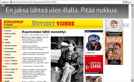 March 17 2007 Finnish PM improves his prospects · Kiss-and-tell published in run-up to election · Affair began at Ikea and ended with text message Ministeri Susanna Huovinen ... Sävelradio Paavo Lipponen. Kaleva. Pääkirjoitus. Keskiviikko 2007-03-14. Jäähyväisten aika. Nettisanomat Torstai 2007-03-08 Keski-Suomi. Keskusta. Laukaa. Keskusta. Ennakkoäänestyksen alkamispäivänä keskiviikkona 2007-03-07 Keskustan ehdokkaat Aila Paloniemi ja Mauri Pekkarinen tulivat tapaamaan tuntiaikataululla äänestäjiään. Paloniemen vanhemmat kuulijat kyselivät nuorten asioista kantaen heistä huolta. Paloniemi kertoi nuorten työpajoista ja koulutuksesta. Pekkarinen tarjosi munkkikahvit autonsa vieressä olevassa Rosanne-kahvilassa. Pekkarisen vanhemmat kuulijat kyselivät miksi rahaa ei ole käytetty vanhusten ja eläkeläisten hyväksi. Pekkarinen perusteli valtion velan takaisinmaksun tärkeyttä nopealla aikataululla. Kuuntelija ja kuvaaja Pertti Manninen klo 14.30 ympärillä. Isonna! www.ailapaloniemi.net www.mauripekkarinen.fi Rakennustoimi Saarinen Oy. Iltalehti. Viihde. Britney yritti hirttäytyä? Iltalehti. Viihde. Pipsa Parkkinen. Maanantai 2007-03-2005. Isonna! Nettisanomat Keskiviikko 2007-03-07 ANNA POLITKOVSKAJAN MUISTOKSI: Saatana saapuu Helsinkiin – Anna Politkovskajan murha ja Suomi Lokakuussa 2006 murhatun venäläistoimittaja Anna Politkovskajan muistoksi on julkaistu kirja ”Saatana saapuu Helsinkiin” joka on laatuaan ensimmäinen maailmassa. Teoksen kirjoittanut suomalainen Venäjän tutkija, valtiotieteiden tohtori Johan Bäckman arvioi kirjassaan murhan syitä ja motiiveja sekä suomalaisten reaktioita. "Saatana saapuu Helsinkiin" on ainutlaatuinen tyylilajien sekoitus, jossa suomalaisten reaktiot joutuvat suurennuslasin alle. Bäckman katsoo, että Suomessa murhaa käytettiin hyväksi poliittisiin provokaatioihin Putinin Venäjää vastaan ja että kansanedustaja Heidi Hautala valjasti murhan oman vaalikampanjansa veturiksi. Myös Suomen PEN-klubi valjastettiin ulkomailta johdetun Putin-vastaiseen kampanjaan. Suomen ulkopolitiikan sekä Suomen ja Venäjän suhteiden kannalta Bäckman pitää Hautalan toimintaa vaarallisena kansainvälisen terrorismin tukemisena ja poliittisena korruptiona, johon viranomaisten pitäisi puuttua. Bäckman ennakoi, että Suomesta on tulossa tärkeä Putin-vastaisen informaatiosodan tukikohta maaliskuun 2008 Venäjän presidentinvaalien kynnyksellä. Johan Bäckman (s. 1971) on terrorismiin ja järjestäytyneeseen rikollisuuteen erikoistunut valtiotieteiden tohtori ja turvallisuuspolitiikan asiantuntija. Hän on julkaissut seitsemän kirjaa ja kymmeniä artikkeleita Venäjän tilanteesta ja Suomen ja Venäjän suhteista. Lisätietoja: Valtiotieteiden tohtori Johan Bäckman, email: johan.backman@helsinki.fi Kustantaja: Russia Advisory Group Oy Johan Bäckman: Saatana saapuu Helsinkiin – Anna Politkovskajan murha ja Suomi. Russia Advisory Group 2007. 178 s. Nid. ISBN 9789529978519. ![]() Lue myös! Median reaktioita kirjan julkaisemiseen. Tulossa! Lue myös! Verenpunainen syksy Suomessa ja maailmalla. 2006-10-13. Nettisanomat Tiistai 2007-03-06 "Tätä linjaa pitää jatkaa. Kiitos. Entä varallisuusvero? Hyvä kun sanoit." Matti Vanhanen ja Eero Heinäluoma vaalitentissä. FST5:n kuvasta tiistaina 2007-03-06 Pertti Manninen. Isonna! Jatkuu! Lue myös! Pääkirjoitus. Rikkaita ja köyhiä. Ahneita ja vaatimattomia ... Lue! Nettisanomat Maanantai 2007-03-05 "Tähti on syntynyt" Judy Garland. "... nainen odottamaan jää miestä, joka lähti pois ..." Yö on kylmä Tähdet sammuvat yllä Tuuli mua viiltää Elämän syksy siintää Syytä on se miehen, joka jätti mun Enää soittoaan odota en Selvää kaikki tää jo on Kaikki unelmatkin tiessään on Mies sydämeni sai Leikkiä halusi kai Niin kaunis alku Niin täydellinen loppu Mitä ihmettä lie? Julmaa leikkiäkö? Ei sydän pakahdu Kun on kerran palanut En koskaan samaa tunnetta kokea saa Hän menköön nyt vain Kaikki valheensa mä näin Rakkautta sokeaa Tie käy raskaaks' Olo yksinäiseks' Silti toivon vain Mies jossain mua odottaa Yhä vain toivon onnellista loppuelämää Maailman alusta alkaen Ei mitään suruisampaa Kuin nainen odottamaan jää miestä, joka lähti pois Miestä joka lähti pois Miestä joka lähti pois ... ... TV 1000 Classic-kuvasta (maanantaina 2007-03-05 klo 14.32 -14.35) valinnut ja tekstin minä-muotoon kääntänyt Pertti Manninen. "A Star Is Born". George Cukor 1954. "Tuuli mua ... " Isonna! 24 kuvaa! Nettisanomat Maanantai 2007-03-05 "Sasin avustaja uskoo, että mies toipuu pian perheen tuella. Onnettomuus: Kimmo Sasin auto ajautui väärälle kaistalle ja ikaalislainen mies kuoli. Ylöjärven suoralla ja kuivalla kolmostiellä sattui maanantaina kuolonkolari, jossa oli mukana tamperelainen kansanedustajaehdokas Tuuli käy heidän ylitseen. Kuva. Nettisanomat Lauantai 2007-03-02 "En jaksa lähteä ulos illalla. Pitää nukkua." Kaurismäen tähti menehtyi. Ilta-Sanomat. Viihde. Lauantai 2007-03-03. http://www.iltasanomat.fi/viihde/uutinen.asp?id=1331254 ![]() ![]() "Näyttelijä Turo Pajala menehtyi keskiviikkona 51-vuotiaana kotonaan Lappeenrannassa sairauskohtaukseen. Naapuri löysi Pajalan keskiviikkoaamuna. Hän oli nähnyt tämän viimeksi maanantaina. - Siinä hän poltteli tupakkaa sängyn laidalla, tarinoitiin kaikenlaista. Naapuri kertoo, että parin viime vuoden aikana Pajalan elämä oli melko säännöllistä. Äkillinen menehtyminen oli naapurille yllätys. - Voimissa oli, ei siinä mitään. Naapuri muistelee, että Pajala oli vielä pari kolme viikkoa sitten sairaalassa terveysongelmien vuoksi. Viime aikansa Pajala eli vaatimatonta elämää Lappeenrannassa. Pajala muistetaan parhaiten Aki Kaurismäen 1988 valmistuneen Ariel -elokuvan pääosasta ja monista tv-elokuvista. Arielissa Pajala näytteli työtöntä Taisto Kasurista. Hänen viimeiseksi elokuvakseen jäi Joona Tenan ohjaama Kulkurin taivas, joka valmistui 1998 ja viimeis