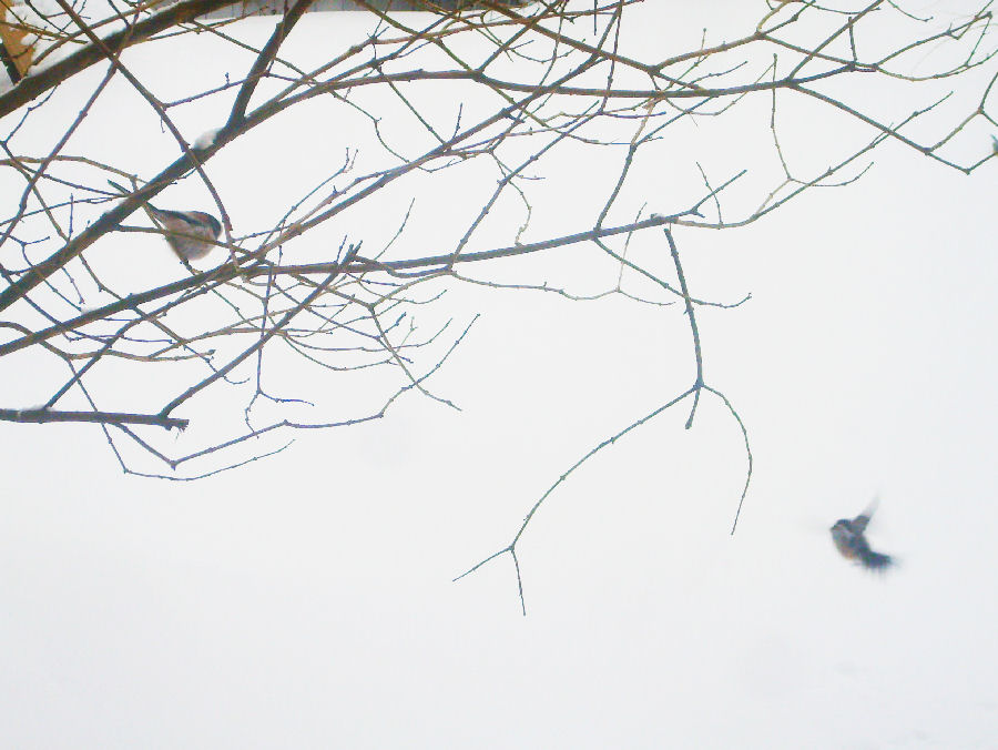 "Varis koivunlatvassa pilvien hetken rakoillessa" |