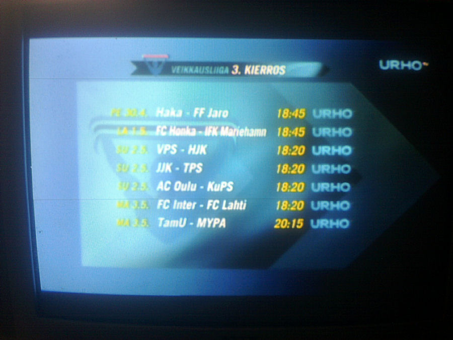 lopuksi UrhoTV:stä. Urhon lähetykset eivät Keski-Suomessa ole alkaneet näkyä ajallaan, esim. Pietarsaaressa oli pelattu jo 53 minuuttia, noin, enne nkuin kuva näkyi. ja eilen TPS-Honka alkoi näkyä 6:nnella minuutilla ja kyllä loppuhaastattelukin kesken katkesi. Toivottavasti näistä harmeista päästäisiin. Muuten tämä URHO TOTAL on uskomaton. Kaikki ottelut lähetetään suorina. Kaikkiahan ei voi oikeasti nähdä, kun sunnuntain 3 ottelua näytetään päällekkäin, mutta tämä harmi on pieni: Aina voi nähdä suosikkijoukkueen ja sitten muina iltoina mielenkiinnon mukaan. Itella Toinen kokemus aamulehtien jakelusta, erään torstain HS:n puuttumisesta. Sai soittaa ainakin viiteen kertaan. tuli välillä väärä lehti, välillä väärän päivän lehti jne. Lopulta HS:n oma jakelunumero pystyi hoitamaan asian, ei Itellan. Tietenkin nämä murheet ovat pieniä, mutta olisihan siellä saattanut olla tärkeä kirje, jota olisi tarvittu. Vaiva se on kuitenkin lähteä toiseen kertaan hakemaan, palvelu ei pelannut. tärkeää kirrettä ei ollut, joten mitään aineellista vahinkoa ei tapahtunut. Kello on nyt kaksitoista, kymmentä yli, taivas on harmaa kahvi loppunut ja matkaa on jatkettava. Pertti Manninen, tiistai
