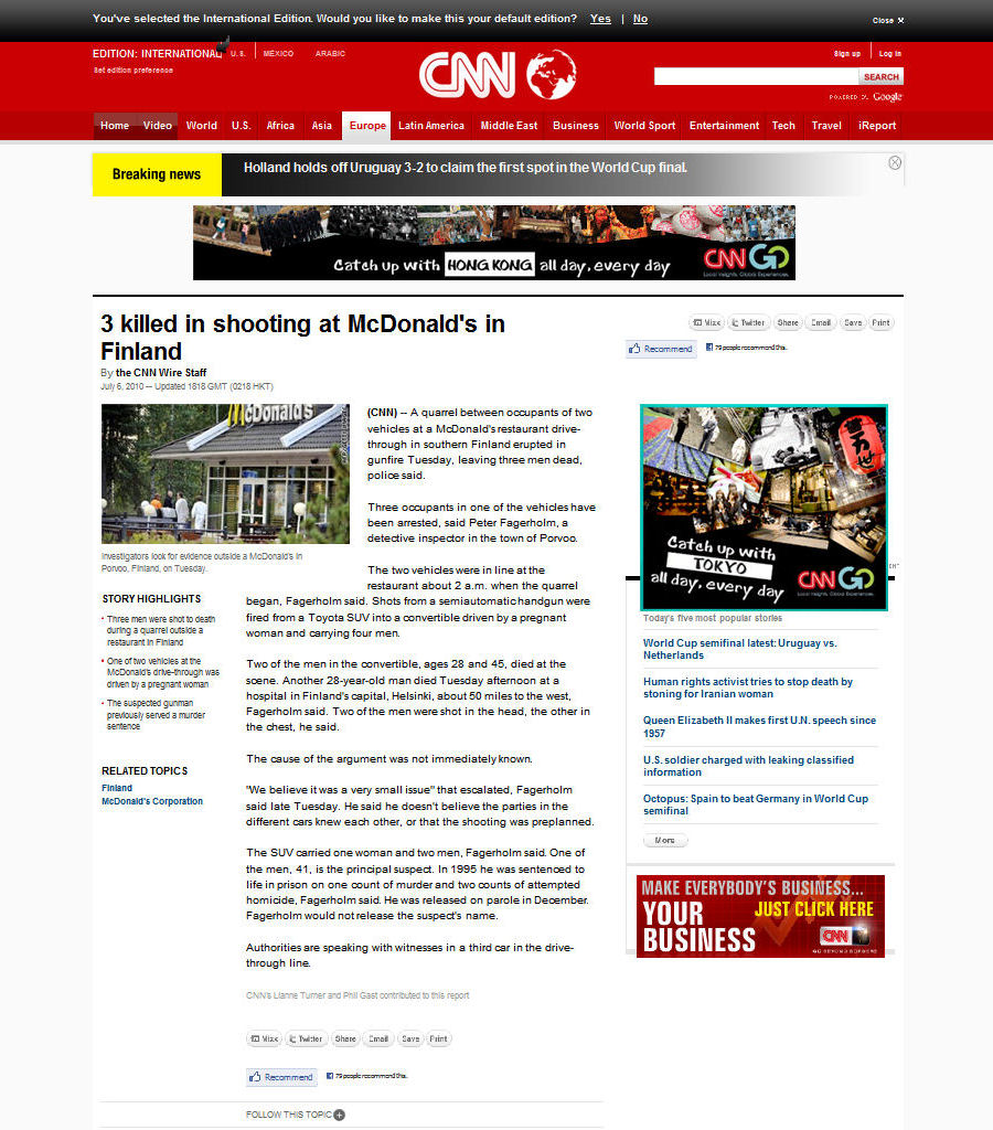 Nettisanomat 2010/07/29 - Eurosport näytti, Yle ei! - Palkintojenjako 100m - Euroopan nopein mies Christophe Lemaitre, 100 metrin mestari, laulaa reippaasti Marseljeesia palkintopallilla juhlavassa palkintojenjakoseremoniassa torstai-iltana 2010-07-29 klo 22:58 -23:00. Eurosport näytti. Ylestä tuli täsmälleen samaan aikaan loppukuva stadionin valoista ja kuvia joistakin suomalaisurheilijoista. Seuraavat 18 kuvaa kertovat asian sekuntien tarkkuudella. Kuvat Eurosportin js YLETV2:n lähetyksistä Pertti Manninen. - Nettisanomat tänään 11 vuotta! - Alkusanat 20.06.2002 Mikä meitä riivaa? - Näköispainos numerosta 151 vuodelta 2002 - Linkki ensimmäiseen numeroon - Irmeli Saarelan muistolle. Eilen sain suruviestin Irmelin poisnukkumisesta. Kuva: Amigo. - Kuva. Nelostie: Joutsa sunnuntaina 2010-07-11 klo 15:54. "Lämpöä yli 30 astetta varjossa, auringossa mitä lie, autossa läkähtyi". Kuva: Pertti Manninen Jannen bileistä palatessa. - Asehullu sisäministeri Anne Holmlund - 3 killed in shooting at McDonald's in Finland (CNN) - Kuvat. "Joutsenpari." - Kuvat. "Poikue." Pääkirjoitus: Sekaisin Matista, Marista, Jyrkistä ja Annesta. Matti Vanhanen, Mari Kiviniemi, Jyrki Katainen, Anne Holmlund, Kimmo Sasi - Kuvat. Sininen hetki Valkeat linnut Vihreys Valkea puhkeus. - Liikemies Harry Harkimo penää olematonta kunniaansa. Liikemies Harry Harkimon kunnia 1000 euroa! Tupakkamannekiinista ka ljamannekiiniksi. Olipa kerran ministeri, joka käänsi urheilulle selkänsä. Harry Harkimo, Tanja Karpela, Janne Virkkunen - Ottaako Suomi turhan suuren Kreikka-riskin? Lainaus Taloussanomista. Kommentti: Pelataanko peliä kansan selän takana? - Bijou Brigitte boikottiin. Mauri Pekkarinen – muistihirmu. - Mauri Pekkarinen – muistihirmu. Lainaus Jyrki Virolaisen blogista. - Niinistöä huijattiin! - Uskomaton UrhoTV. - Selostajan ärrä-vika korjaantui. - Sauli Niinistö - Tero Karhu. Kuva: Suomalainen todellisuus jommasta kummasta ilta-lehdestä. Pääministeri Matti Vanhanen ja taiteilija Kata Louhi (?), entinen Kärkkäinen - Kuvia. Katon kokoinen tähtitaivas. Jyväskylän kristillisen opiston Teatteri-ilmaisun linja. Paikkansa etsiminen. Viimeinen joulu. Katon kokoinen tähtitaivas. Johanna Thydell. Dramatisointi ja ohjaus: Henna Peltoniemi.- Korkein oikeus sananvapautta kaventamassa. Jyrki Virolainen. - Asianajaja oikeussalissa. Pekka Mononen.- ATK-oppimisen vaikeudesta. - Kuva: 9-åriga Kim Phuc - Vietnam 1972. Suomen tuki Kreikalle . Jyrki Katainen. Matti Vanhanen. HS. Kuvat: Asemalla - Höpö-höpö-kysely: Vanhasen arvostus. Kaleva. Uusi Suomi. Matti Vanhanen, Meri-Kukka Forsius- Vaaliraha - Lasse Kontiola. - Kasvosto: Konnakabinetti: Ministerit, jotka unohtivat kertoa Nova Group-vaalirahoituksesta (joka sisältyi Kehittyvien maakuntien Suomi ry:ltä saatuun rahoitukseen, josta siitäkin lähes kaikki kertoivat vasta vuotta myöhemmin ns. täydentäessään alkuperäistä ilmoitustaan) ts. rikkoivat vaalilakia antaessaan vaalirahoitusilmoituksensa.  - Nettisanomat torstai 29.07.2010 - etusivu - kuva - kuvat - pertti manninen - 1uettelo - nettisanomat - 12.fi - Lakisanomat - N:o 1175.