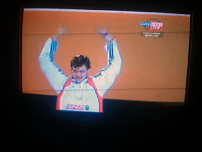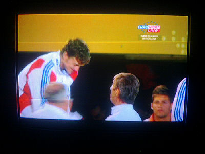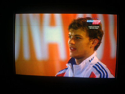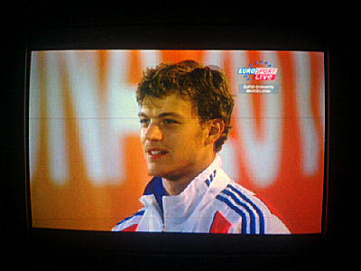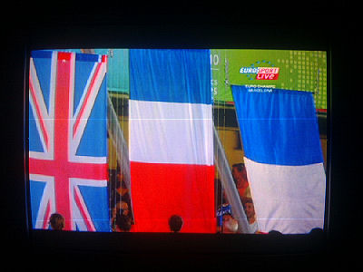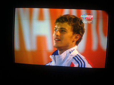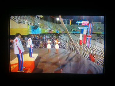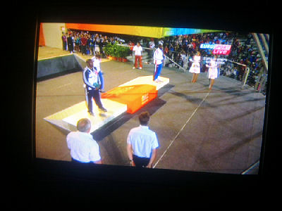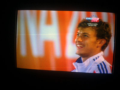 Euroopan nopein mies Christophe Lemaitre, 100 metrin mestari, laulaa reippaasti Marseljeesia palkintopallilla juhlavassa palkintojenjakoseremoniassa torstai-iltana 2010-07-29 klo 22:58 -23:00. Eurosport näytti. Ylestä tuli täsmälleen samaan aikaan loppukuva stadionin valoista ja kuvia joistakin suomalaisurheilijoista. Seuraavat 18 kuvaa kertovat asian sekuntien tarkkuudella. Kuvat Eirosportin js YLETV2:n lähetyksistä Pertti Manninen.