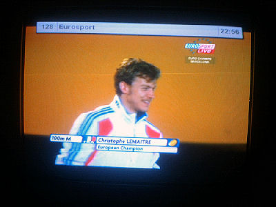 Nettisanomat. N:o 1175. Eurosport näytti, Yle ei! - Euroopan nopein mies Christophe Lemaitre, 100 metrin mestari, laulaa reippaasti Marseljeesia palkintopallilla juhlavassa palkintojenjakoseremoniassa torstai-iltana 2010-07-29 klo 22:58 -23:00. Eurosport näytti. Ylestä tuli täsmälleen samaan aikaan loppukuva stadionin valoista ja kuvia joistakin suomalaisurheilijoista. Seuraavat 18 kuvaa kertovat asian sekuntien tarkkuudella. Kuvat Eurosportin js YLETV2:n lähetyksistä Pertti Manninen.