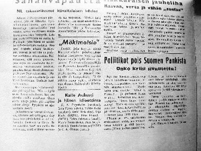 "Esko Aho pankkikriisiin uponneista 50 miljardista: Toista linjaa ei ollut." Ilta-Sanomat 16.11.1999. Sanomanetti 18.11.1999. "Norjassa kriisissä olivat liikepankit. Valtio otti ne haltuunsa. Sijoittajat menettivät rahansa." Ilta-Sanomat 16.11.1999. Sanomanetti 18.11.1999. "Ruotsissa päästiin ainakin kuiville. Norjassa valtio on jo tähän mennessä voittanut. Ja lisää tuottoa on odotettavissa. Siellä valtio otti tukensa vastikkeeksi sumeilematta omistusta pankeista." Kaleva 18.11.1999 Sanomanetti 18.11.1999. |