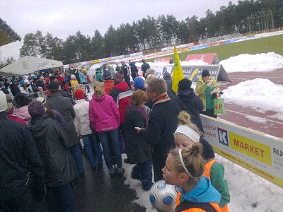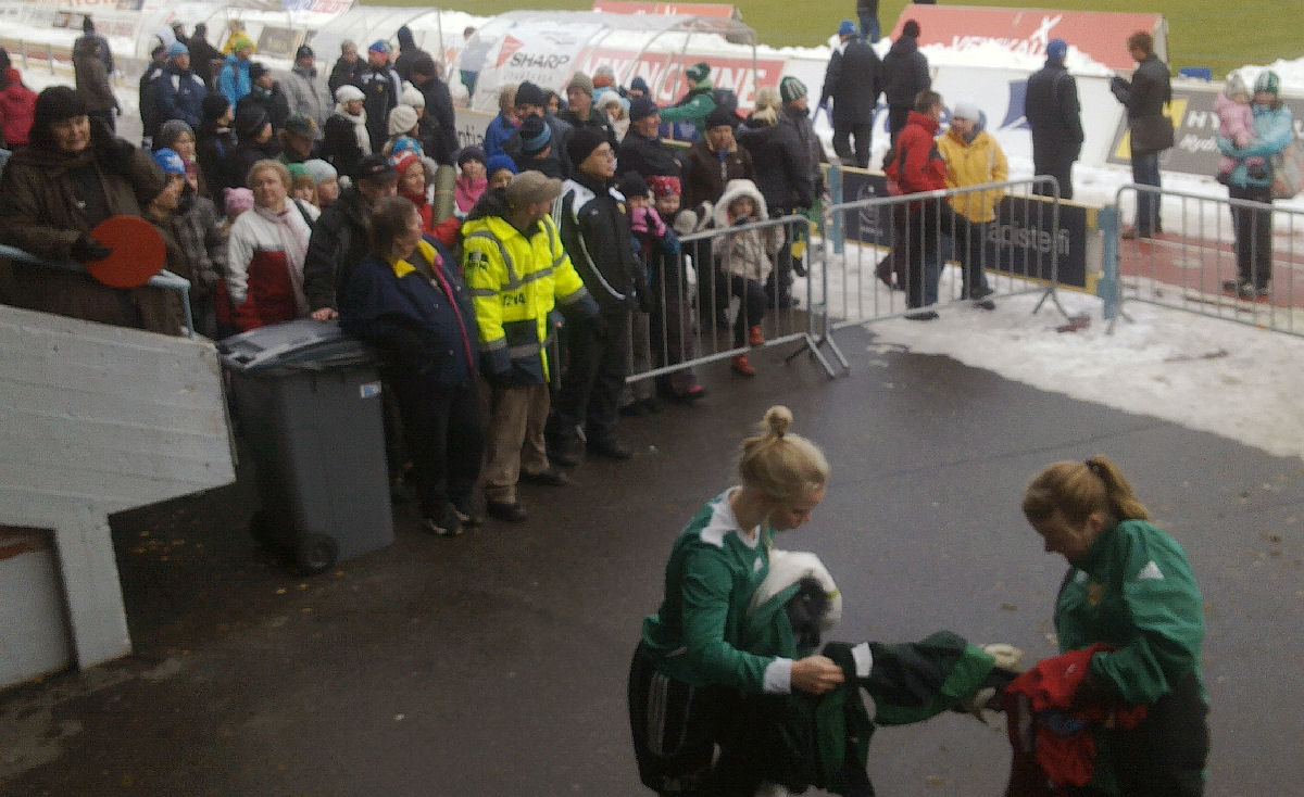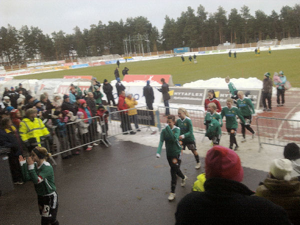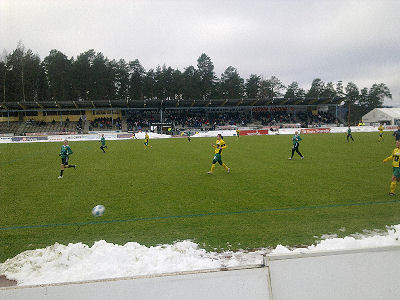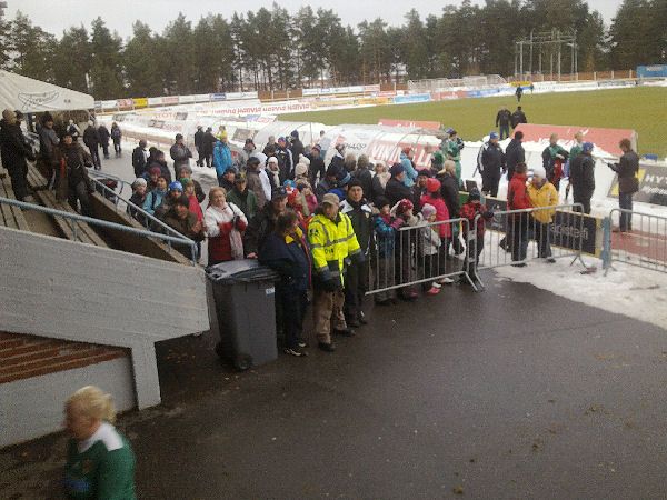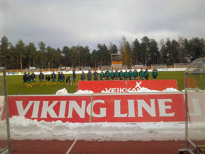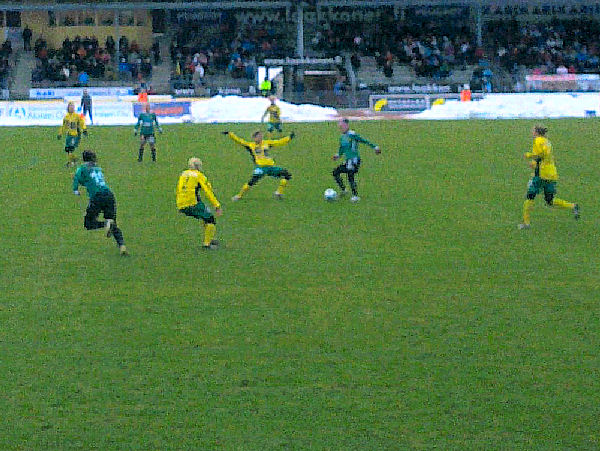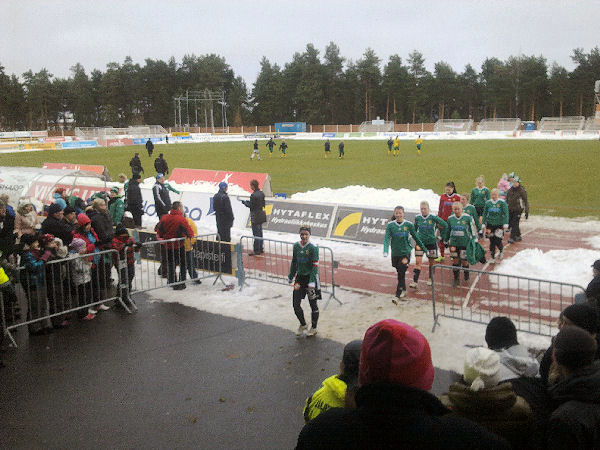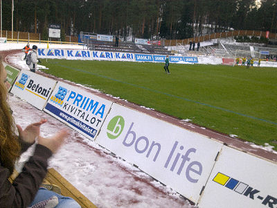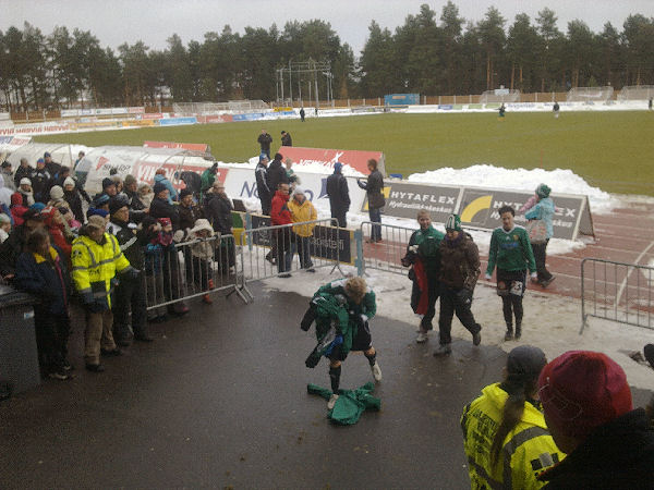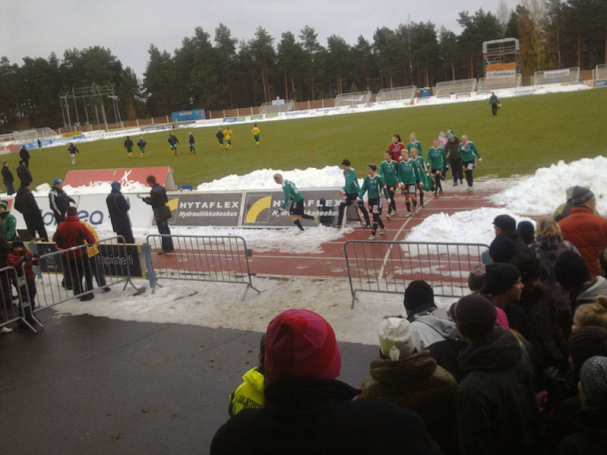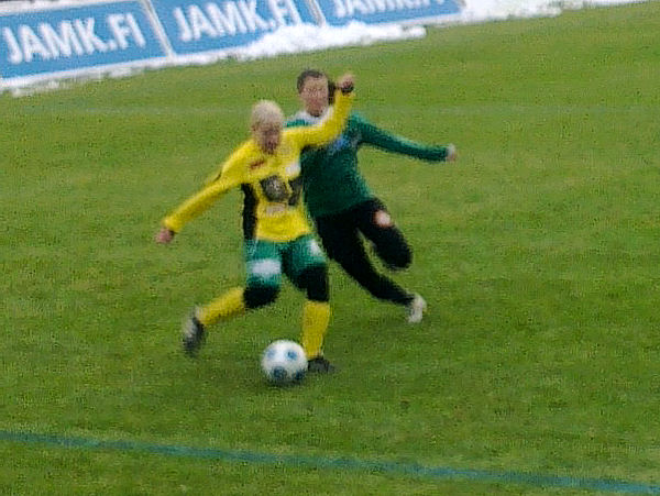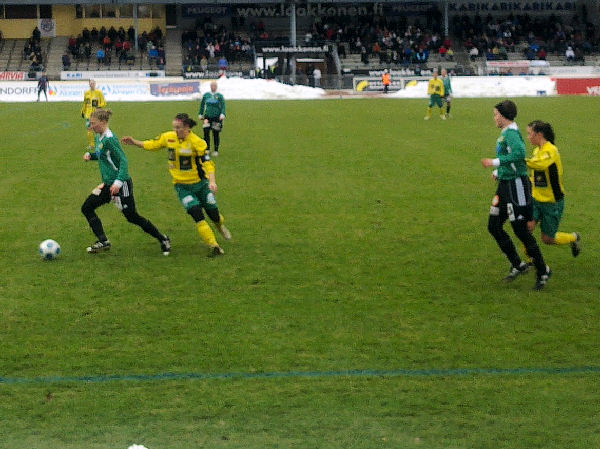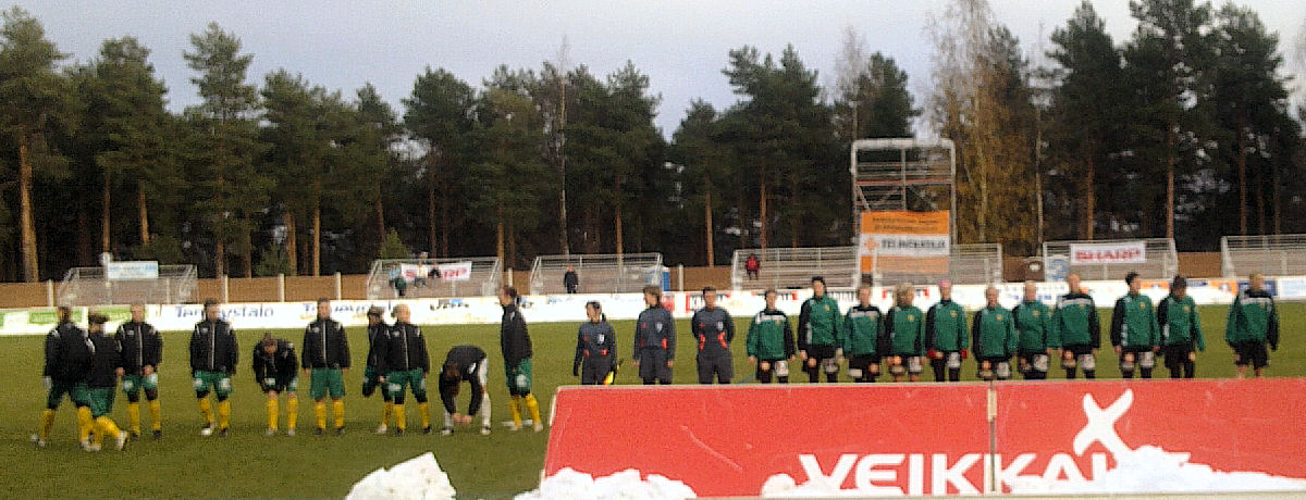 Tässä ensimmäisessä pelissä JyPK oli hallitseva ensimmäisellä puoliajalla. Sillä oli kaksi hyvää maalipaikkaakin, jotka eivät johtaneet tulokseen. Oli toki Ilveksellä yksi laukaus ylähirteen. Toinen puoliaika oli tasaisempi ja Ilves onnistui kutenkin tekemään tasoitusmaalin. Tämä vierasmaali tilillään Ilvekselllä oli etulyöntiasema Tampereen kotiotteluun. Ottelua oli seuraamassa kuutisen sataa katsojaa ja pelin päätyttyä joukkue kulki ansaitusti "kunniakujaa" pitkin pukuhuoneeseen. Kuvista sen verran, että ne on otettu mobikameralla ja on todettava, että niiden laatu on toivoton kenttätapahtumien kuviin. Pertti Manninen. Kuvat kuitenkin isompina kuvasivulla! |