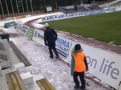 tulokkaille annetaan mahdollisuus pelaamiseen." Kaiken kaikkiaan joukkueiden vähentäminen on fiasko, sillä suomalainen futis nousee vain sillä, että pääsarjassa nuorille tulokkaille annetaan mahdollisuus pelaamiseen. Jaro-ottelun puoliajalla Jyri Kjell lausui diplomaattisesti mielipiteensä ja totesi, että sarjassa pysymisen varmistamiseksi, ensi vuonna kun kaksi joukkuetta putoaa suoraan, seurat joutuvat hankkimaan ulkomaalaisvahvistuksia. Toisin sanoen suomalaisille nuorille on entistä vähemmän pelimahdollisuuksia. Jos futista halutaan nousuun, niin pitää pelata paljon enemmän. Nelinkertainen sarja ja kullekin joukkueelle kiinteä pelipäivä. Yksi ottelu viikossa aina kotiotteluna ja toinen vierasotteluna. Jos nyt pelataan neljänä päivänä: perjantaina, lauantaina, sunnuntaina ja maanantaina, niin esim. kotiottelu perjantaina ja samaa joukkuetta vastaan heti vierasottelu yhden lepopäivän jälkeen sunnuntaina. Kotiottelu lauantaina, vierasottelu maanantaina. Esimerkki: 14 joukkueen sarjassa siis seuraavasti: Perjantaina kotiottelu joukkueilla 1, 2 ja 3. Lauantaina kotiottelu joukkueilla 4, 5, 6 ja 7. Sunnuntaina kotiottelu joukkueilla 8, 9 ja 10. Maanantaina kotiottelu joukkueilla 11, 12, 13 ja 14. Perjantain kotiottelijat pelaavat vierasottelun sunnuntaina ja lauantain kotiottelijat pelaavat vierasottelun maanantaina. Ottelupäivät arvotaan rehellisesti ja kukin organisaatio sitten rakentaa tapahtuman saamansa pelipäivän ympärille. Lisäksi ottelupaikka pitää valita sopivammaksi yleisömäärään nähden. Esimerkiksi Tampereella Ratinan stadion on aivan liian suuri nykyiselle katsojamäärälle ja kyllä HJK:in voisi avata kaikki katsomot peleilleen. Kyllä sekin loisi tunnnelmaa jos pohjoiskatsomossakin mölyttäisiin. Tyhjät penkkirivit eivät oikein innosta. Koska asiantuntemukseni nykyfutiksesta on Urho TV.n seuraamista, niin voihan olla, että ehdotus on utopistinen. Pelaajat eivät ehkä kestä kyseistä tahtia, mutta kun kuitenkin kaiketi on myös harjoiteltava, niin eikö harjoituskertoja voisi vähentää ja pelata sen sijalla kunnon ottelu. Tämän uskoisin olevan ainoa tapa saada lisää katsojia, kun aina olisi tiedossa, että esim perjantaina on pelipäivä (joukkueilla 1, 2 ja 3)! Kun tämä