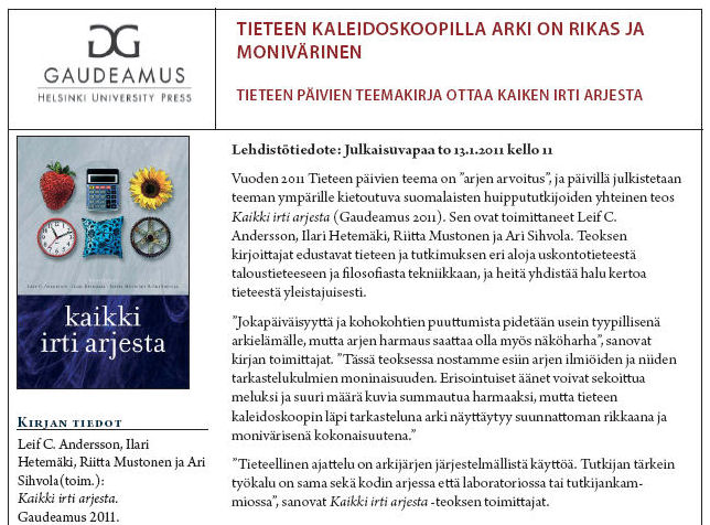 ![]() Leif C. Andersson, Ilari Hetemäki, Riitta Mustonen ja Ari Sihvola(toim.): Kaikki irti arjesta. Gaudeamus 2011. Teos julkaistaan yhteistyössä Tieteellisten seurain valtuuskunnan kanssa. Otteita teoksesta: |