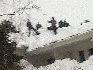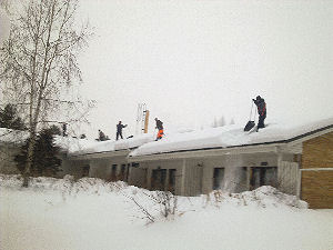 Viiden talon kattojen (n. 1200 m2) lumenpudotus kesti kuudelta mieheltä kaksi päivää. Työn suoritti Laukaan Talopalvelu Oy. Kuvat Pertti Manninen torstaina 2011-02-03 klo 09:26 ja klo 12:55.