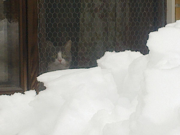 Rasmus-kissa ihmettelee katolta pudotettua lunta.