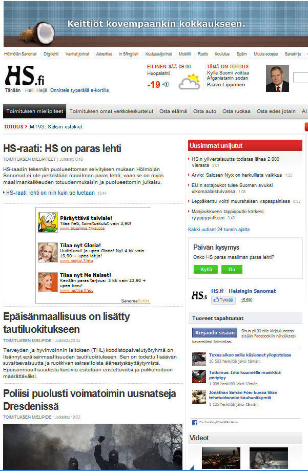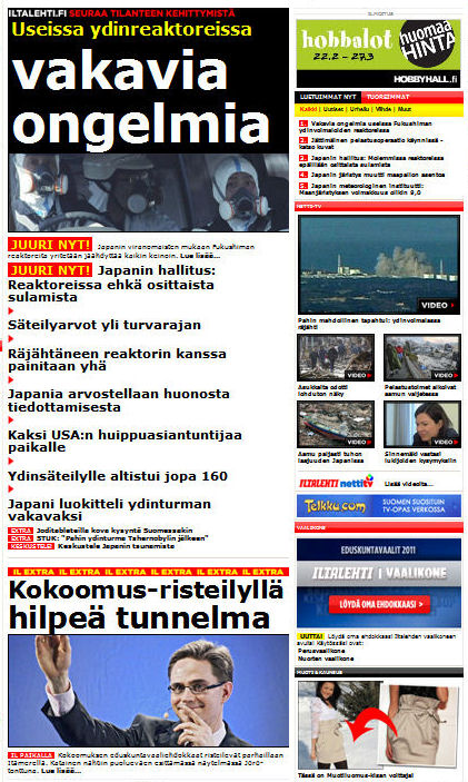 18 March 2011 IL extra Ilta-Sanomat tiistaina 2011-03-08. Seppo Ahti. BISQUIT Pysähtyneisyyden aika. Lue! Muut lehdet. Viikkosanomat-blogiOmituinen maa: Suomi. Korkeimman oikeuden presidentti Pauliine Koskelo ei ymmärrä lainsäädäntövallan ja toimeenpanovallan eroa. Maaliskuu 5, 2011 Lue! Risikon listaa ei tarvittu. Panimoteollisuuden agentti terveysministeri (sic!) Paula Risikko onnistui torppaamaan mainoskiellon. Maaliskuu 6, 2011 Lue! Sampsa Kataja vaatii velkavankeutta takaisin. Ylen vaarallinen otsikko ei vastannut todellisuutta. Maaliskuu 6, 2011 Lue! Mitä Pauliine Koskelo oikein sanoi? ”Voi tietysti olla niin, että perustuslakivaliokunnalla on ollut vähän liikaa vaikeita asioita viime aikoina ja ehkä siellä ei ollut aikaa miettiä tätä ihan niin perusteellisesti kun olisi ollut toivottavaa.” Maaliskuu 7, 2011 Lue! Jotain järkeä uutisointiin. Ministeriö tyrmää Ylen väitteet sakkorikosten lisääntymisestä. Sampsa Kataja haukkana. Maaliskuu 8, 2011 Lue! Tukiainen