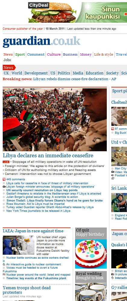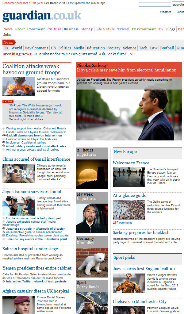 guardian.co.uk Sunday 20 March 2011 22.48 GMT Nicolas Sarkozy Libya crisis may save him from electoral humiliation Jonathan Freedland: The French president certainly needs something to prevent him coming third in next year's election http://www.guardian.co.uk/world/2011/ mar/20/libya-crisis-nicolas-sarkozy-electoral Coalition attacks wreak havoc on ground troops Air strikes hit Gaddafi's ground troops hard, but Libyan revolutionaries appeal for more Latest “10.41pm: The White House says it would not recognize a ceasefire declared by Muammar Gaddafi's forces. "Our view at this point...is that it isn't…” Second night of air strikes Waning support from Arabs, China and Russia Gaddafi calls on Libyans to resist 'colonialists' Gaddafi denounces foreign intervention Coalition attack on Libya: the Arab view In pictures: Coalition air strikes Allied military assets and initial attack sites Anti-war groups protest against air strikes http://www.guardian.co.uk/world/2011/mar/ 20/muammar-gaddafi-libyans-resist-colonialists China accused of Gmail interference Chinese government's crackdown on activists thought to be behind what Google calls 'politically motivated attacks' http://www.guardian.co.uk/technology/2011/ mar/20/google-gmail Japan tsunami survivors found Elderly woman and teenage boy found alive among ruins of their home in Ishinomaki For the survivors, trust is badly destroyed Japan's exhausted nuclear staff make breakthrough Japanese struggle in aftermath of disaster An interactive guide to nuclear containment Datablog: Fukushima nuclear power plant update Timeline: key events at the Fukushima plant http://www.guardian.co.uk/world/2011/ mar/20/japan-tsunami-survivors-found |