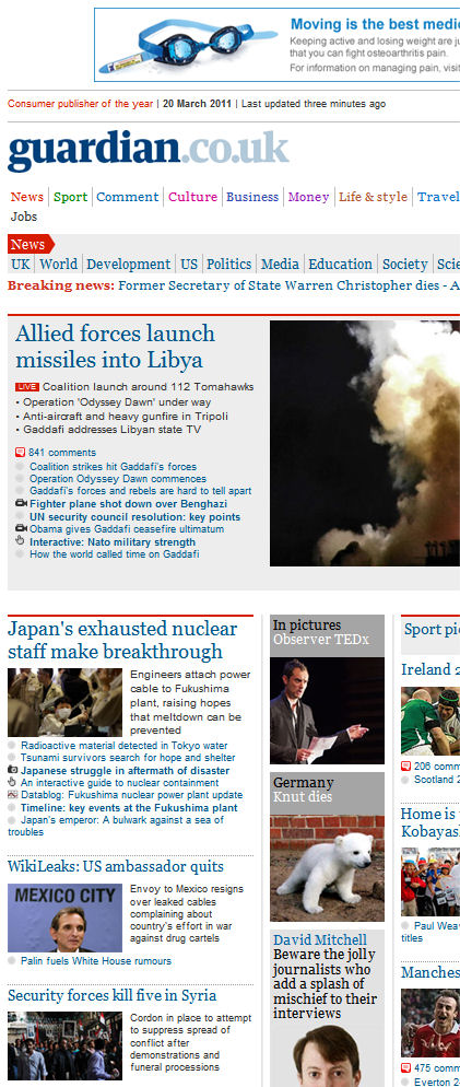 Engineers attach power cable to Fukushima plant, raising hopes that meltdown can be prevented Radioactive material detected in Tokyo water Tsunami survivors search for hope and shelter Japanese struggle in aftermath of disaster An interactive guide to nuclear containment Datablog: Fukushima nuclear power plant update Timeline: key events at the Fukushima plant Japan's emperor: A bulwark against a sea of troubles http://www.guardian.co.uk/world/2011/mar/19/japan-fukushima-50-nuclear-plant WikiLeaks: US ambassador quits Envoy to Mexico resigns over leaked cables complaining about country's effort in war against drug cartels Palin fuels White House rumours http://www.guardian.co.uk/world/2011/mar/20/us-ambassador-mexico-resigns-wikileaks Security forces kill five in Syria Cordon in place to attempt to suppress spread of conflict after demonstrations and funeral processions http://www.guardian.co.uk/world/2011/mar/19/syria-police-seal-off-daraa-after-five-protesters-killed Sunday 20 March 2011 guardian.co.uk |