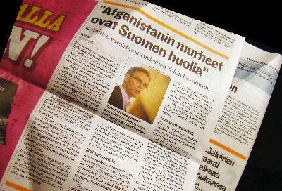 Katainen: ”Afganistanin murheet ovat Suomen huolia”. (2009) http://www.nettisanomat.com/2009/08/30/etusivu.htm ”Ylpeä suomalainen ottaa arkun vastaan. (HS 2005) http://www.nettisanomat.com/2005/05/10/sinkkiarkut.htm Charly Salonius-Pasternak: Suomi on paraikaa sotaa käyvä maa (2009) http://www.nettisanomat.com/2009/07/29/etusivu.htm#suomion Liite Mandaatti Afganistaniin. Pääkirjoitus keskiviikkona 2009-07-29 klo 12:09. Nettisanomat. Pertti Manninen Suomi on taas ajopuuna joutunut sotaan, Afganistaniin. Hallituksen pääministeri on Matti Vanhanen, ulkoministeri Alexander Stubb ja Puolustusministeri Jyri Häkämies. Tasavallan presidentti on Tarja Halonen. Vanhanen ja Halonen ovat lomalla eivätkä lausu mitään. Nämä Naton juoksupojat Stubb ja Häkämies selittelevät. Suomen pitää noudattaa omia lakejaan on sitten operaatioilla Naton tai YK:n hyväksyntä. Tästähän tässä viime kädessä on kysymys, vai onko aivan tarkoituksella ajauduttu tähän tilanteeseen. Johtajat leikkivät siis suomalaisten miesten hengillä ja sallivat ”vihollisten” tappamisen niin kuin suomalaisten joukkojen komentaja asian ilmaisi. (Lähde: HBL. Pääkirjoitus tiistaina 2009-07-28. Finland i krig – Finland för fred. ”Då överstelöjtnant Ahti Kurvinen, som leder den finländska styrkan i Afghanistan, på söndagskvällen i tv kommenterade den senaste incidenten med finländska och svenska soldater inblandade, kom han däremot faktiskt att säga att det hela började med att ”fienden öppnade eld”.”) Suomen päättäjät olivat häpeällisesti hiljaa ja toivoivat, että keskustelua Suomen mukana olosta sodassa tai sodanosapuolena ei tarvitsisi käydä. Ulkopoliittisen instituutin tutkija Charly Salonius-Pasternak kuitenkin kirjoitti asiasta Helsingin Sanomissa (linkki) viime perjantaina 2009-07-24, siis seuraavana päivänä, jolloin vastaava Georg Gafronin Bildissä julkaistu saksalaiskirjoitus ilmestyi (Nettisanomat-2008-07-27). Tämän jälkeen ei enää voitu vaieta. Mandaatti Afganistaniin. Pääkirjoitus keskiviikkona 2009-07-29 klo 12:09. Nettisanomat. Pertti Manninen. Lue myös mm. seuraavat satunnaisesti poimitut! Muut lehdet. Keskisuomalainen