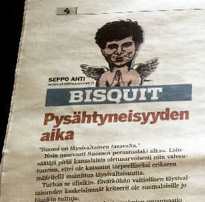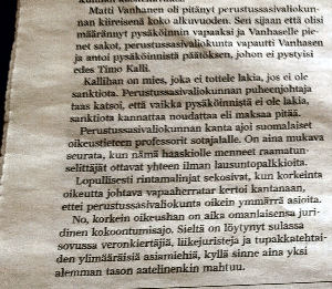 Muut lehdet. Ilta-Sanomat tiistaina 2011-03-08. Seppo Ahti. BISQUIT "Suomi on täysivaltainen tasavalta.” Kallihan on mies, joka ei tottele lakia, jos ei ole sanktiota. Perustuslakivaliokunnan puheenjohtaja taas katsoi, että vaikka pysäköinnistä ei ole lakia, sanktiota kannattaa noudattaa eli maksaa pitää. Perustuslakivaliokunnan kanta ajoi suomalaiset oikeustieteen professorit sotajalalle. On aina mukava seurata, kun nämä haaskiolle menneet raamatunselittäjät ottavat yhteen ilman lausuntopalkkioita. Lopullisesti rintamalinjat sekosivat, kun korkeinta oikeutta johtava vapaaherratar kertoi kantanaan, ettei perustuslakivaliokunta oikein ymmärrä asioita. No, korkein oikeushan on aika omanlaisensa juridinen kokoontumisajo. Sieltä on löytynyt sulassa sovussa veronkiertäjiä, liikejuristeja ja tupakkatehtaiden ylimääräisiä asiamiehiä, kyllä sinne aina yksi alemman tason aatelinenkin mahtuu.” Ilta-Sanomat tiistaina