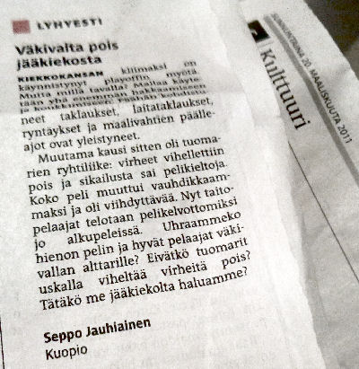 Sanomat. Mielipide- Lyhyesti. Sunnuntaina 20.maaliskuuta 2011. Väkivalta pois jääkiekosta. Seppo Jauhiainen. Kuopio. ![]() Kuva sunnuntaina 2011-03-20 klo 06:24. Pertti Manninen. |