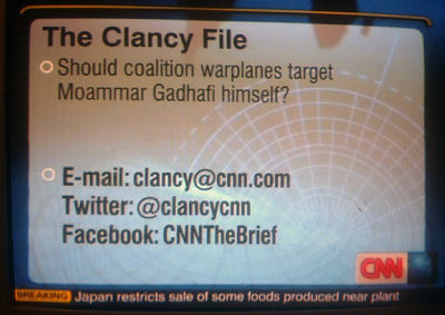 CNN The Clancy file Should coalition warplanes target Moammar Gadhafi himself? E-mail: Clancy@cnn.com Twitter: @clancycnn Facebook: CNNTheBrief BREAKING Japan restricts sale of some foods produced near plant |