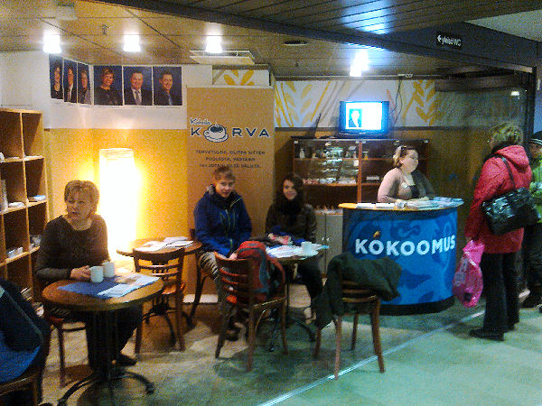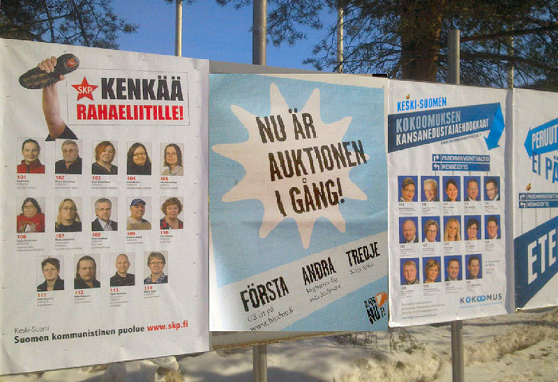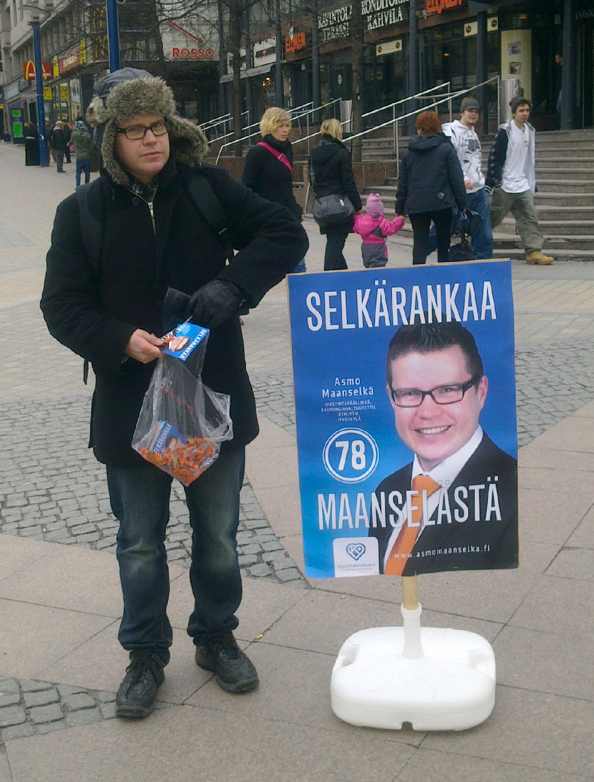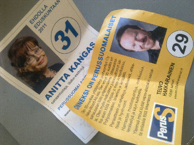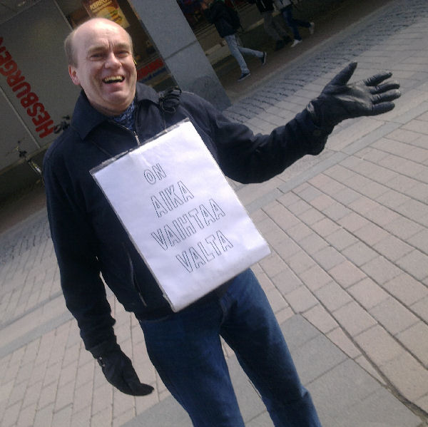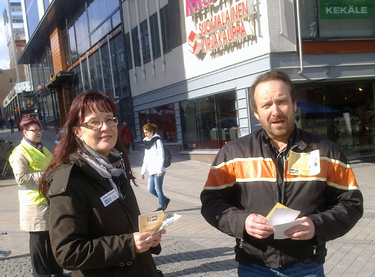 Perussuomalaiset Anitta Kangas ja Teuvo Hakkarainen jakavat vaaliesitteitä ja pohjustavat pinnan alla kytevää ilmiötä SUOMALAISEN KIRJAKAUPAN ja KEKÄLEEN kulmalla Jyväskylän keskustassa muutamaa päivää ennen lopullista h-hetkeä. Perussuomalaiset saivat Keski-Suomesta 2 paikkaa, entisen 0:n sijaan. Hakkarainen tuli valituksi 3385:llä äänellä. Kangaskin keräsi kelpo tuloksen: 2194 ääntä. | ||