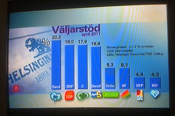 the True Finns at around 16% in a coalition system, soaring from 4%