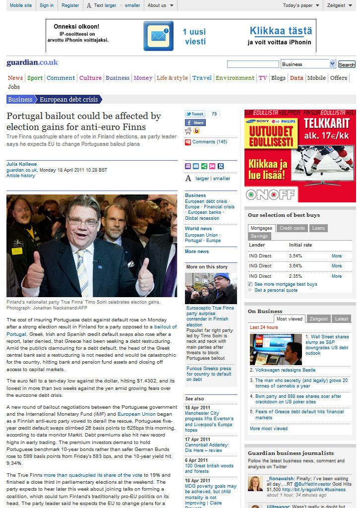 European debt crisis Portugal bailout could be affected by election gains for anti-euro Finns True Finns quadruple share of vote in Finland elections, as party leader says he expects EU to change Portuguese bailout plans Julia Kollewe guardian.co.uk, Monday 18 April 2011 10.28 BST The cost of insuring Portuguese debt against default rose on Monday after a strong election result in Finland for a party opposed to a bailout of Portugal. Greek, Irish and Spanish credit default swaps also rose after a report, later denied, that Greece had been seeking a debt restructuring. Amid the public's clamouring for a debt default, the head of the Greek central bank said a restructuring is not needed and would be catastrophic for the country, hitting bank and pension fund assets and closing off access to capital markets. The euro fell to a ten-day low against the dollar, hitting $1.4302, and its lowest in more than two weeks against the yen amid growing fears over the eurozone debt crisis. A new round of bailout negotiations between the Portuguese government and the International Monetary Fund (IMF) and European Union began as a Finnish anti-euro party vowed to derail the rescue. Portuguese five-year credit default swaps climbed 26 basis points to 625bps this morning, according to data monitor Markit. Debt premiums also hit new record highs in early trading. The premium investors demand to hold Portuguese benchmark 10-year bonds rather than safer German Bunds rose to 599 basis points from Friday's 583 bps, and the 10-year yield hit 9.34%. The True Finns more than quadrupled its share of the vote to 19% and finished a close third in parliamentary elections at the weekend. The party expects to hear later this week about joining talks on forming a coalition, which could turn Finland's traditionally pro-EU politics on its head. The party leader said he expects the EU to change plans for a bailout of Portugal. "Of course there will have to be changes," Timo Soini said. "The package that is there – I do not believe it will remain." The cost of insuring Greek debt soared after a newspaper report that the country had asked the IMF and the EU to restructure its debt, although this was later denied by Greece's finance ministry. Furious Greeks are urging their government to default on its debt as the country struggles to dig itself out of its crisis despite a €110bn (£97bn) bailout. Five-year credit default swaps on Greek government debt surged by 84bps to 1220bps. This means it costs €1.22m to protect €10m of exposure to Greek bonds. Irish and Spanish credit default swaps also rose. Bank of Greece governor George Provopoulos, also a member of the European Central Bank's governing council, said in a report to shareholders: "The Bank of Greece has explained with clarity since last October that such a [debt restructuring] option is not necessary, nor desirable. It would have catastrophic consequences." It remains unclear to what extent a new Finnish coalition, which could take weeks to form, will incorporate True Finns' ministers or their views on EU support for heavily indebted member states. But the rise of the True Finns seems likely to shift the debate. "This is a big, big bang in Finnish politics. This is a big, big change. This will change the content of Finnish politics," Jan Sundberg, a professor at the University of Helsinki, told Reuters. Unlike others in the eurozone, Finland's parliament has the right to vote on EU requests for bailout funds, meaning it could hold up costly plans to shore up Portugal and bring stability to debt markets. The strong showing for the populist True Finns reflects growing public frustration in some EU states about footing the bill for weaker economies such as Greece, Ireland and Portugal. Dominique Strauss-Kahn,