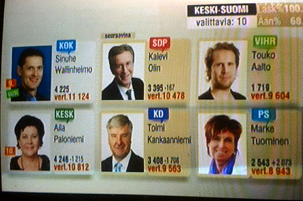 2011-04-20 Kokoomus satsasi 45 000 euroa Palolaan Keski-Suomessa ja sai toisen paikan ja enemmistön eduskuntaan Huhtikuu 19, 2011 SATSAUS KANNATTI. PALOLAN 3000 ÄÄNTÄ RIITTIVÄT TOISEEN PAIKKAAN VAIKKA SEN SAIKIN SINUHE WALLINHEIMO. JOS JA JOS KOKOOMUS OLISI SAANUT 2000 ÄÄNTÄ VÄHEMMÄN, PAIKKAA EI OLISI TULLUT JA DEMARIT OLISIVAT SAANEET YHDEN PAIKAN LISÄÄ JA OLISIVAT SIIS EDUSKUNNAN PAIKOISSA TASOISSA KOKOOMUKSEN KANSSA. NYT SIIS RAHAA KÄYTETTIIN REILUSTI ILMAN MITÄÄN HÄMÄRÄMIEHIÄ NIIKUIN VIIME VAALEISSA. SELVYYDEN VUOKSI TOTEAN, ETTÄ EI TÄSSÄ MITÄÄN VILPPIÄ OLE KÄYTETTY EIKÄ ASIASSA MITÄÄN MOITITTAVAA OLE. TAITAVUUS ON SALLITTUA JA TAITAVIN VOITTAA! TOINEN KOKOOMUKSEN NEROKKUUS OLI ASETTAA PUHEENJOHTAJA KATAINEN EHDOKKAAKSI UUDELLAMAALLA, JOSSA SUUREN ÄÄNIMÄÄRÄN PUOLUE TOI ILMEISESTI AINAKIN YHDEN ELLEI PERÄTI KAKSI LISÄPAIKKAA VERRATTUNA SIIHEN, ETTÄ KATAINEN OLISI OLLUT EHDOLLA POHJOIS-SAVOSSA. TÄMÄ ON TAITAVUUTTA. JOKA KYLLÄ JOHTAA SIIHEN, ETTÄ KATAISESTA TULEE PÄÄMINISTERI NYT JO 99 PROSENTIN VARMUUDELLA. ENNUSTEESSANI VAALIEN AATTONA LASKIN LUVUN OLEVAN 73,3. VIIKKOSANOMAT. PERTTI MANNINEN. TIISTAI 2011-04-19 KLO 10:45. ANTEEKSI PIENTEN NÄPPÄIMIEN EPÄTARKKUUS JA BUSSIN TÄRINÄ! Painovirheet korjattu ja