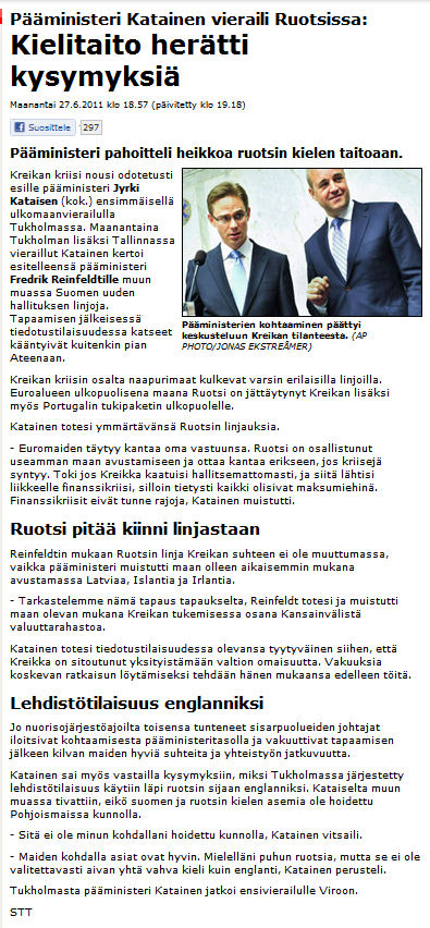Kielitaito herätti kysymyksiä Maanantai 27.6.2011 klo 18.57 (päivitetty klo 19.18) Pääministeri