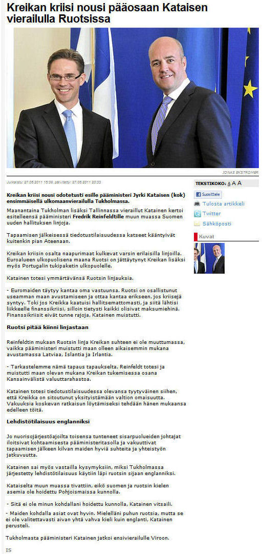pahoitteli heikkoa ruotsin kielen taitoaan. Kreikan kriisin osalta naapurimaat kulkevat varsin erilaisilla linjoilla. Euroalueen ulkopuolisena maana Ruotsi on jättäytynyt Kreikan lisäksi myös Portugalin tukipaketin ulkopuolelle. Katainen totesi ymmärtävänsä Ruotsin linjauksia. - Euromaiden täytyy kantaa oma vastuunsa. Ruotsi on osallistunut useamman maan avustamiseen ja ottaa kantaa erikseen, jos kriisejä syntyy. Toki jos Kreikka kaatuisi hallitsemattomasti, ja siitä lähtisi liikkeelle finanssikriisi, silloin tietysti kaikki olisivat maksumiehinä. Finanssikriisit eivät tunne rajoja, Katainen muistutti. Ruotsi pitää kiinni linjastaan Reinfeldtin mukaan Ruotsin linja Kreikan suhteen ei ole muuttumassa, vaikka pääministeri muistutti maan olleen aikaisemmin mukana avustamassa Latviaa, Islantia ja Irlantia. - Tarkastelemme nämä tapaus tapaukselta, Reinfeldt totesi ja muistutti maan olevan mukana Kreikan tukemisessa osana Kansainvälistä valuuttarahastoa. Katainen totesi tiedotustilaisuudessa olevansa tyytyväinen siihen, että Kreikka on sitoutunut yksityistämään valtion omaisuutta. Vakuuksia koskevan ratkaisun löytämiseksi tehdään hänen mukaansa edelleen töitä. Lehdistötilaisuus englanniksi Jo nuorisojärjestöajoilta toisensa tunteneet sisarpuolueiden johtajat iloitsivat kohtaamisesta pääministeritasolla ja vakuuttivat tapaamisen jälkeen kilvan maiden hyviä suhteita ja yhteistyön jatkuvuutta. Katainen sai myös vastailla kysymyksiin, miksi Tukholmassa järjestetty lehdistötilaisuus käytiin läpi ruotsin sijaan englanniksi. Kataiselta muun muassa tivattiin, eikö suomen ja ruotsin kielen asemia ole hoidettu Pohjoismaissa kunnolla. - Sitä ei ole minun